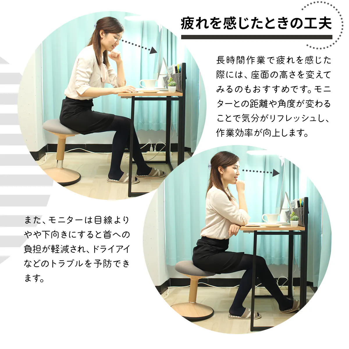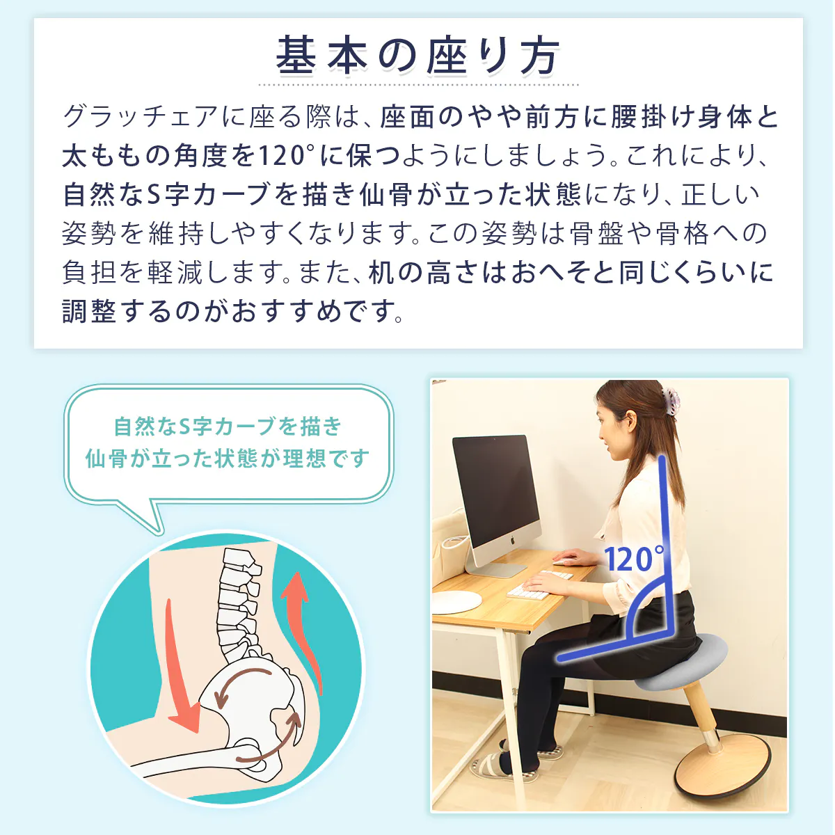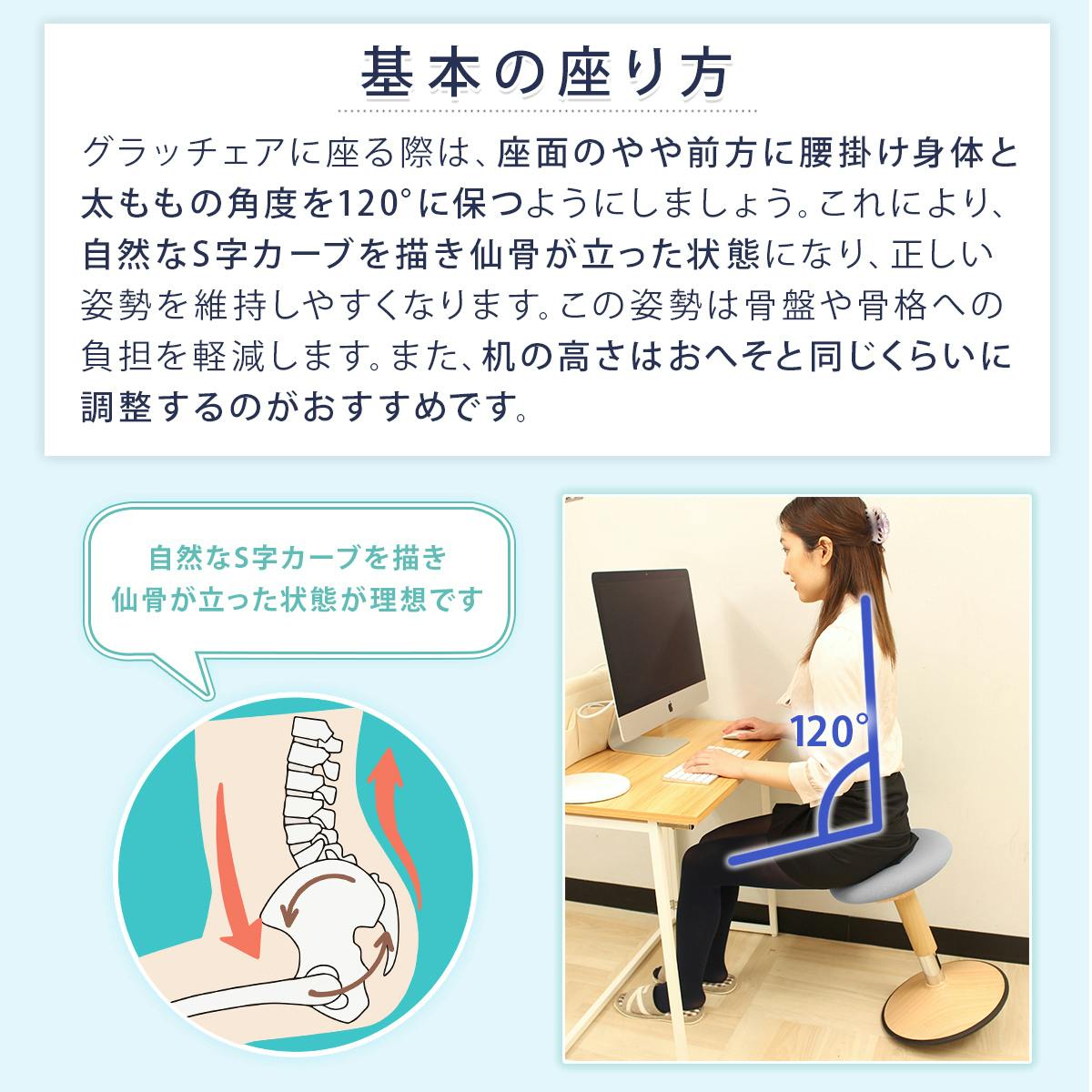 座面よりやや前に腰掛け、体を垂直にして太ももの角度が120度に開くようにすると骨盤が前傾して仙骨が立ち、背中のS字カーブが自然に形成され、正しい座り姿勢をキープしやすくなります。またデスクの高さはおへその高さを同じくらいに調整してください。