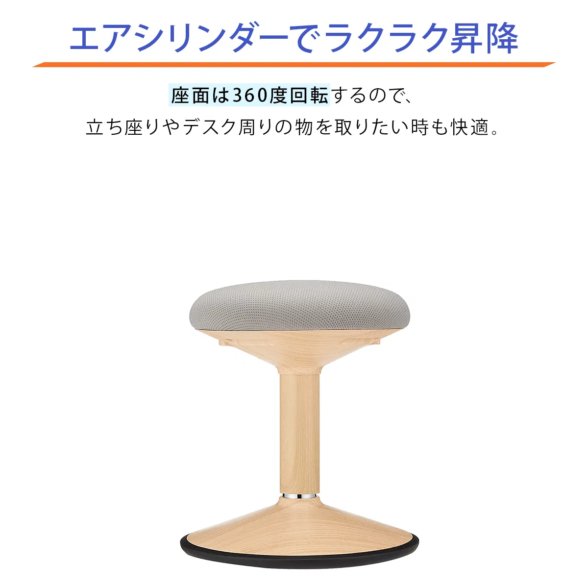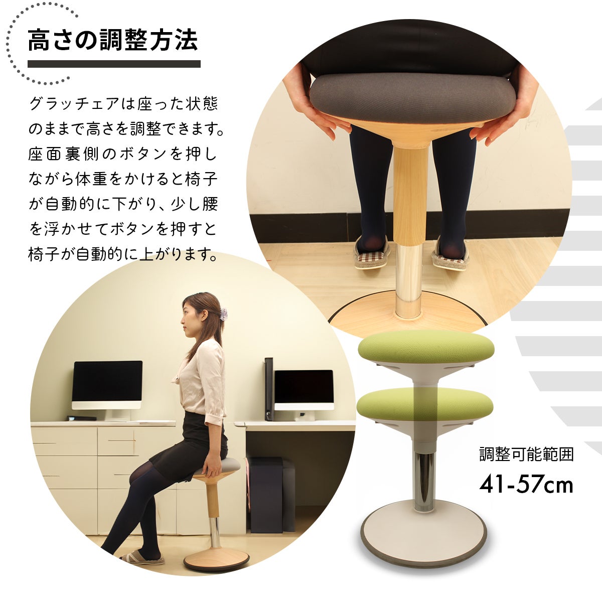 「グラッチェア」は高さ調節機能にエアシリンダーを採用しているので、座面の下のボタンを押せば座ったままワンタッチで最適な高さに調整可能。
