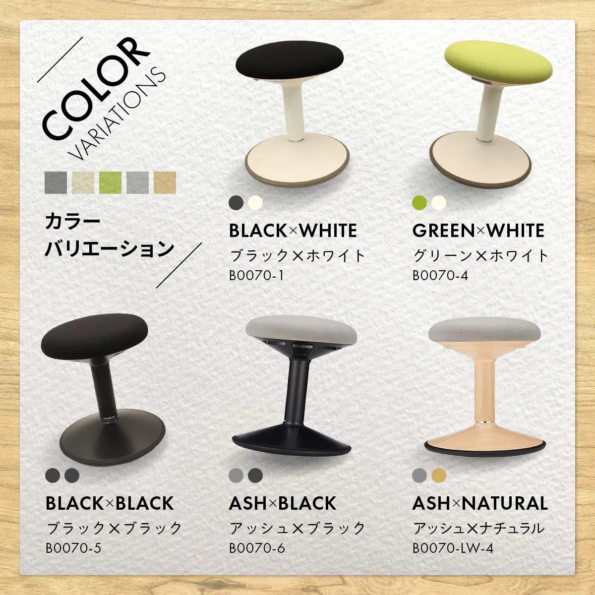 カラー:ブラック×ホワイト、グリーン×ホワイト、ブラック/ブラック、アッシュ×ブラック、アッシュ×ナチュラル