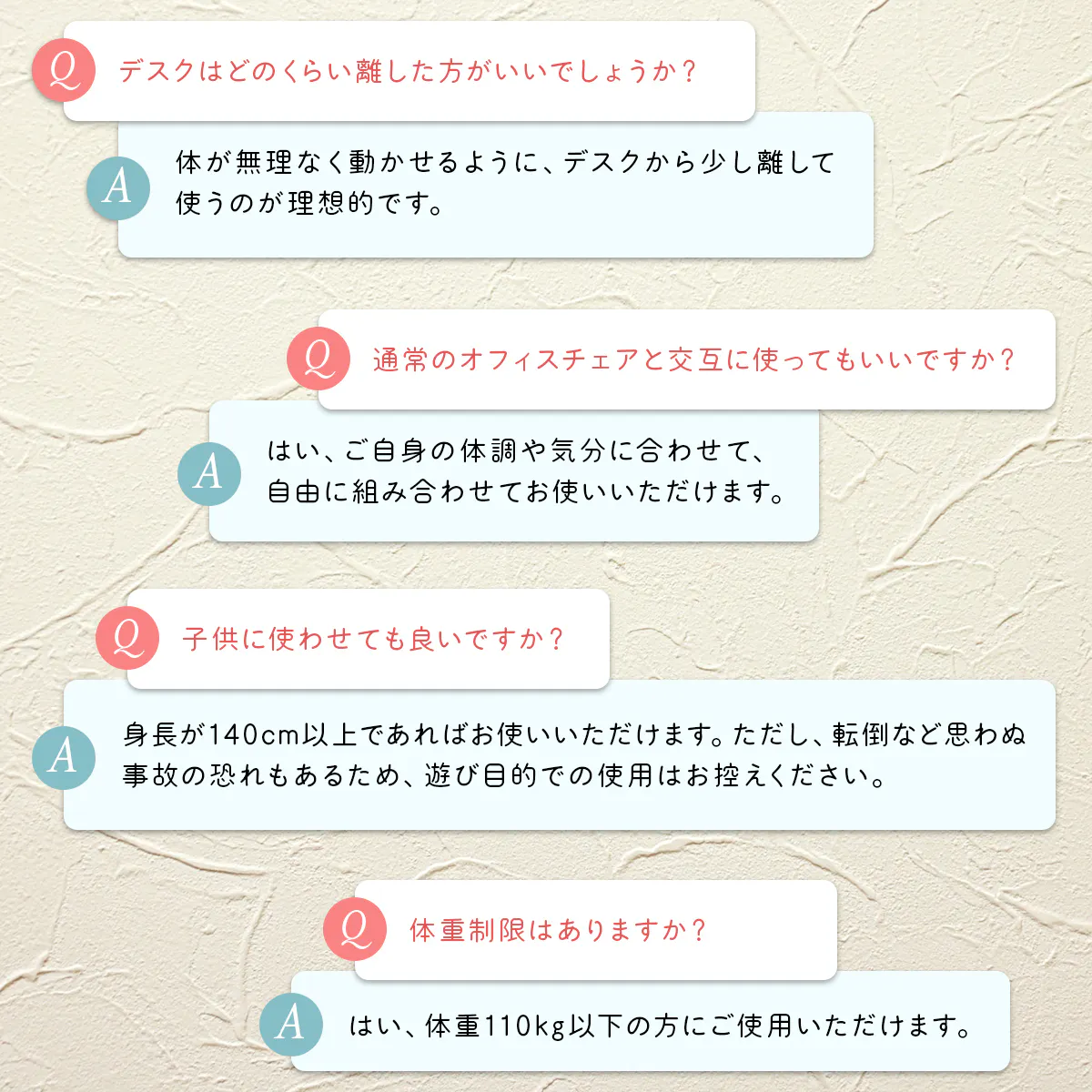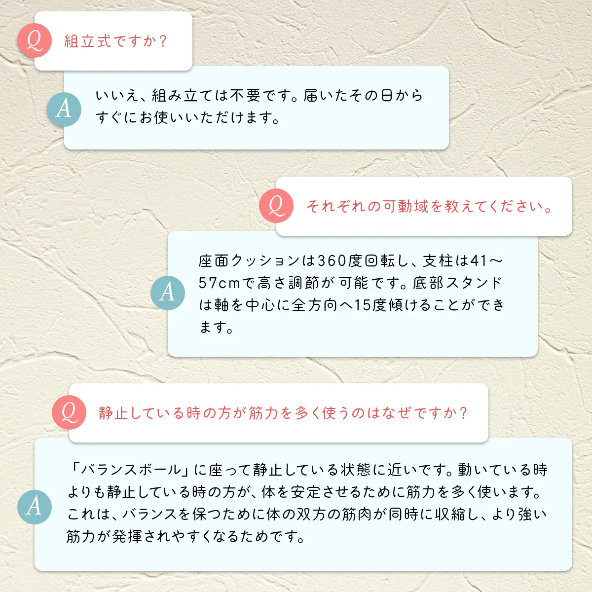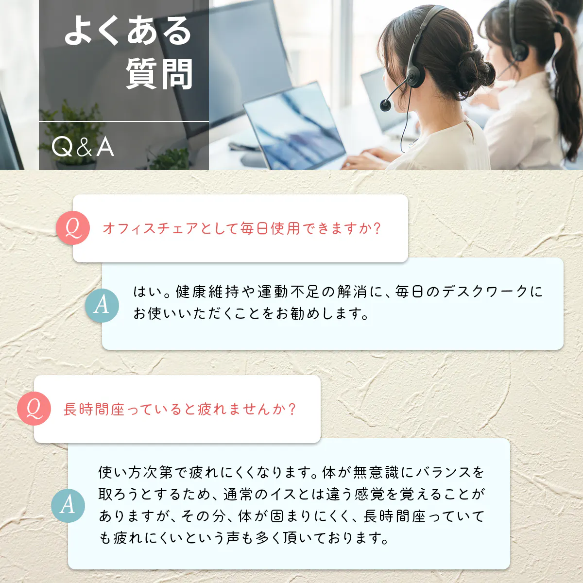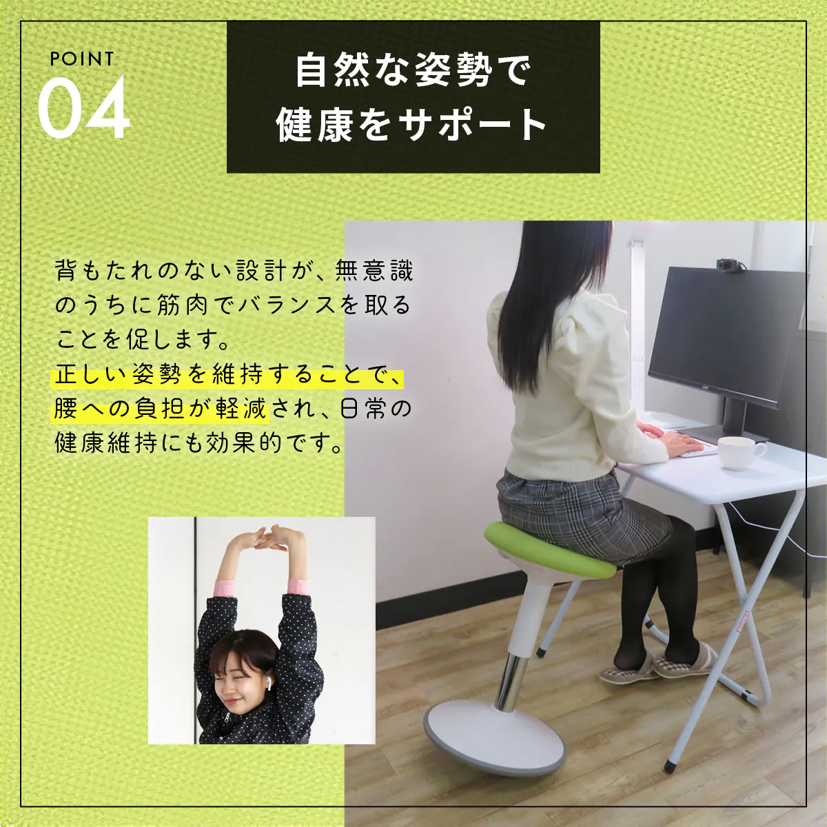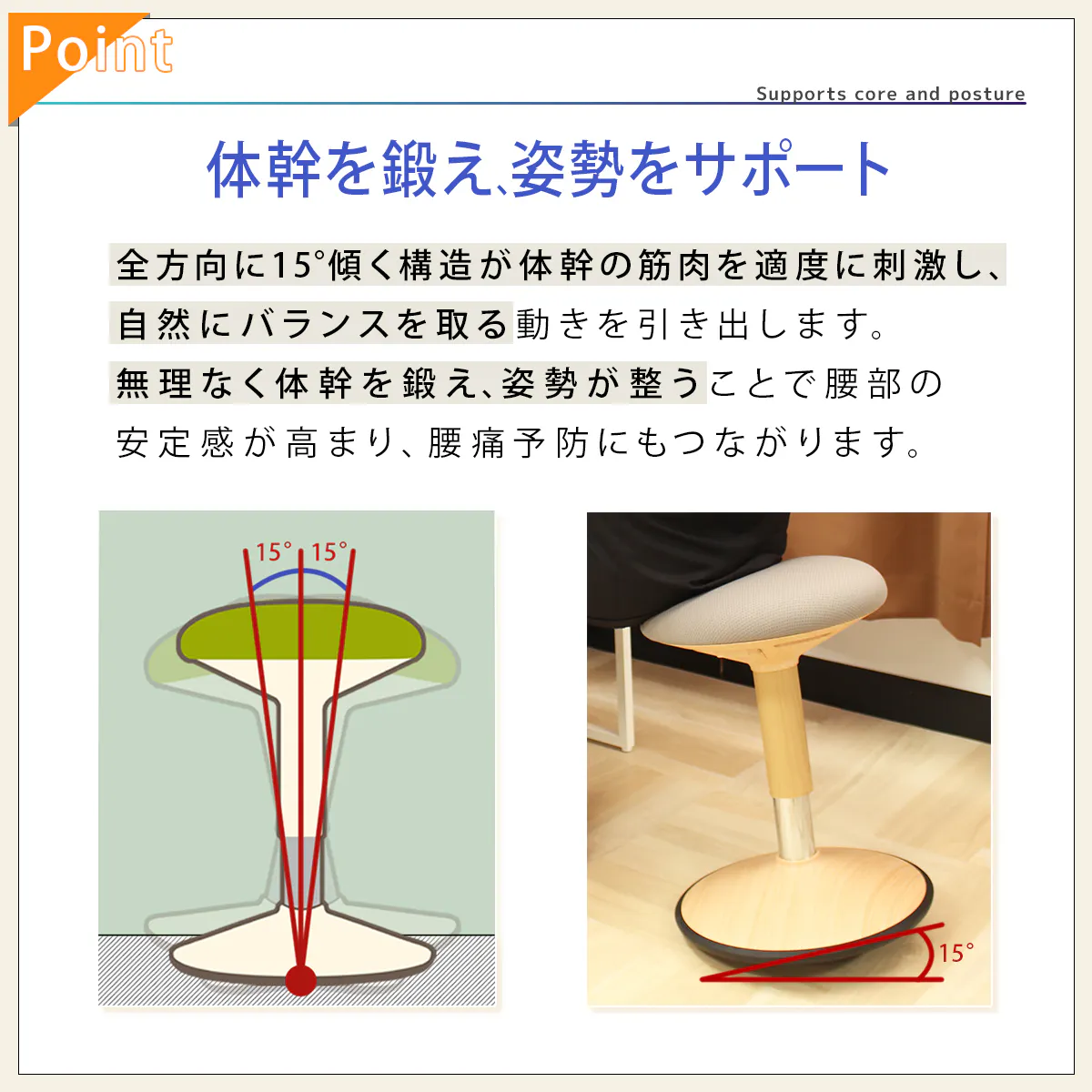 リクライニングのあるオフィスチェアに座るとこれらの筋肉を使われず、体を支える体幹筋が衰え、やがて姿勢が悪化。普段の生活でも腰への負担が増大してしまいます。