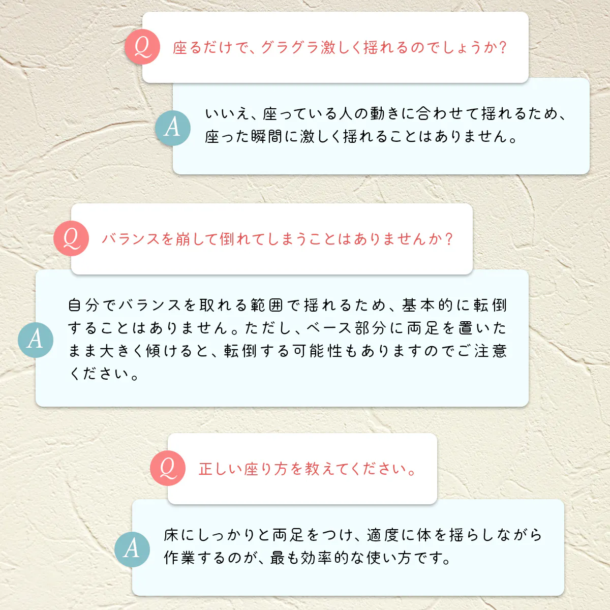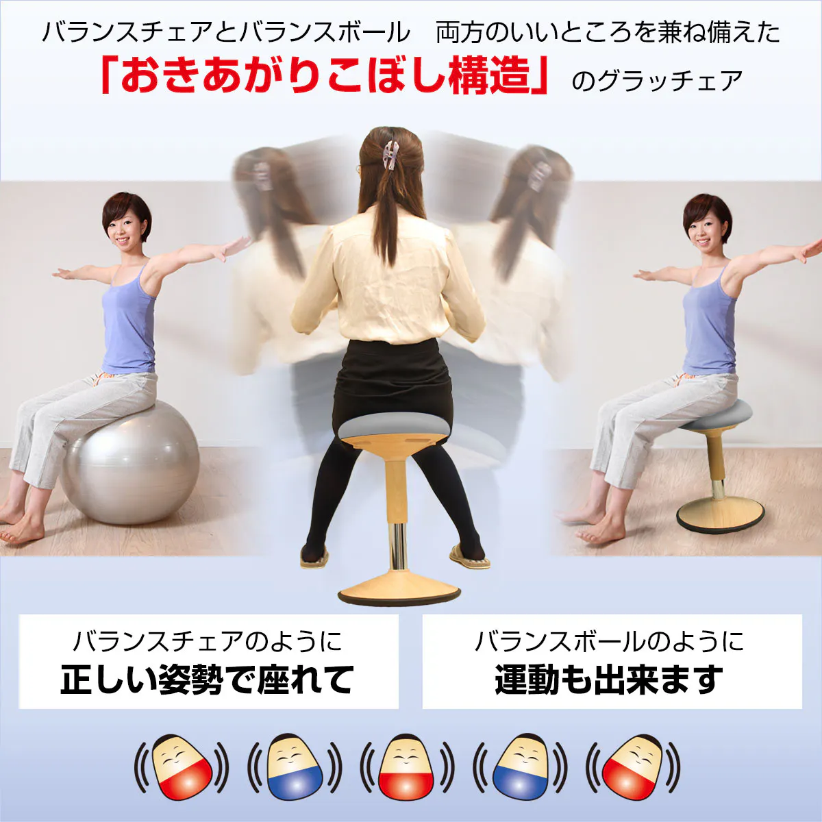 「グラッチェア」はどちらから倒しても必ず垂直に立ち直る「おきあがりこぼし構造」に着想し、座りながら硬直しがちな腰や背中の筋肉を効率的にストレッチし、さらには体幹を鍛えて正しい姿勢に導く画期的なオフィスチェアです。人間工学に基づいた設計で、ストレッチボールと同じようにグラグラ揺れますが、座り心地は驚くほど快適!「グラッチェア」が腰、肩、首の負担をスッキリ解決します。