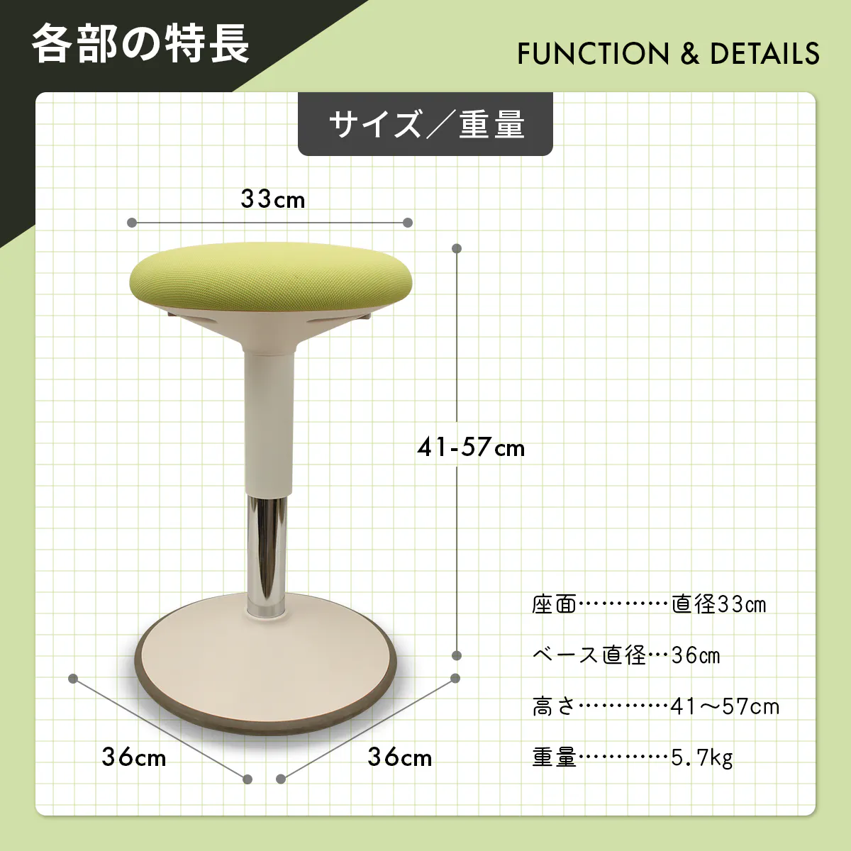 サイズ:高さ41~57cm、座面直径33cm、ベース直径36cm