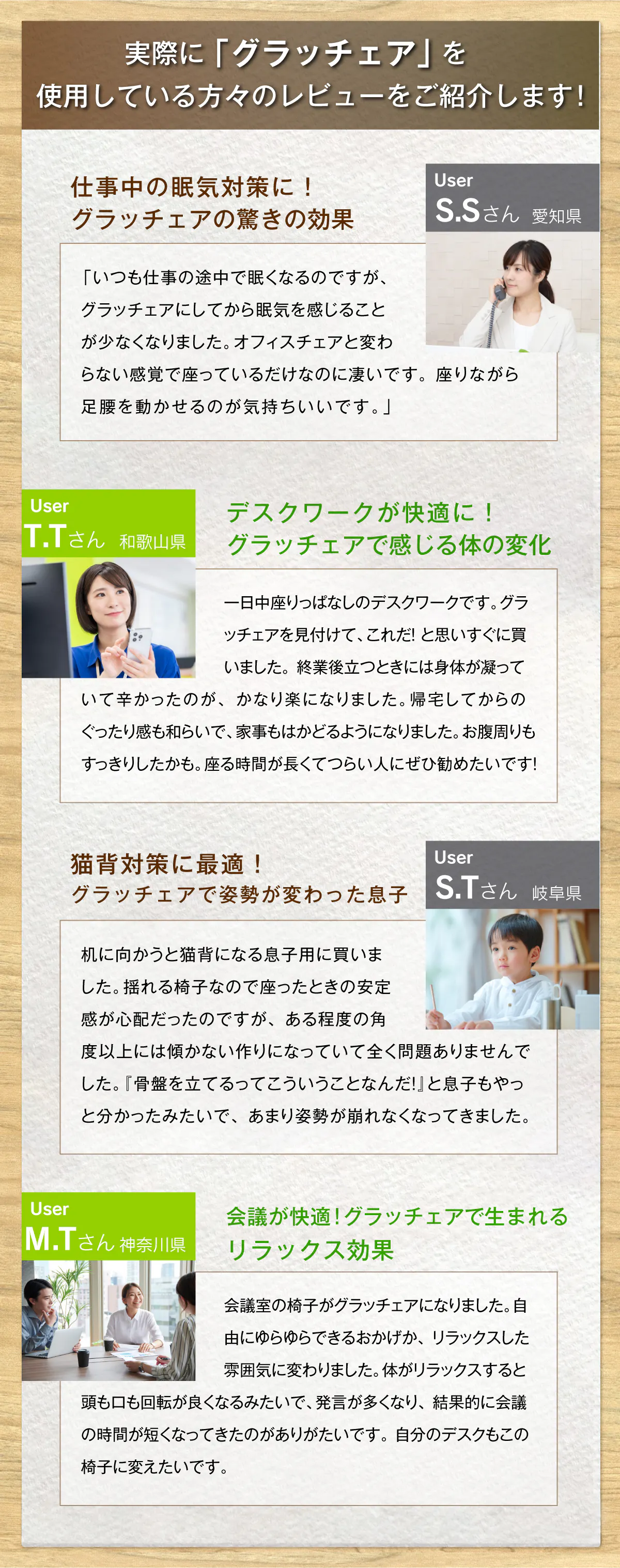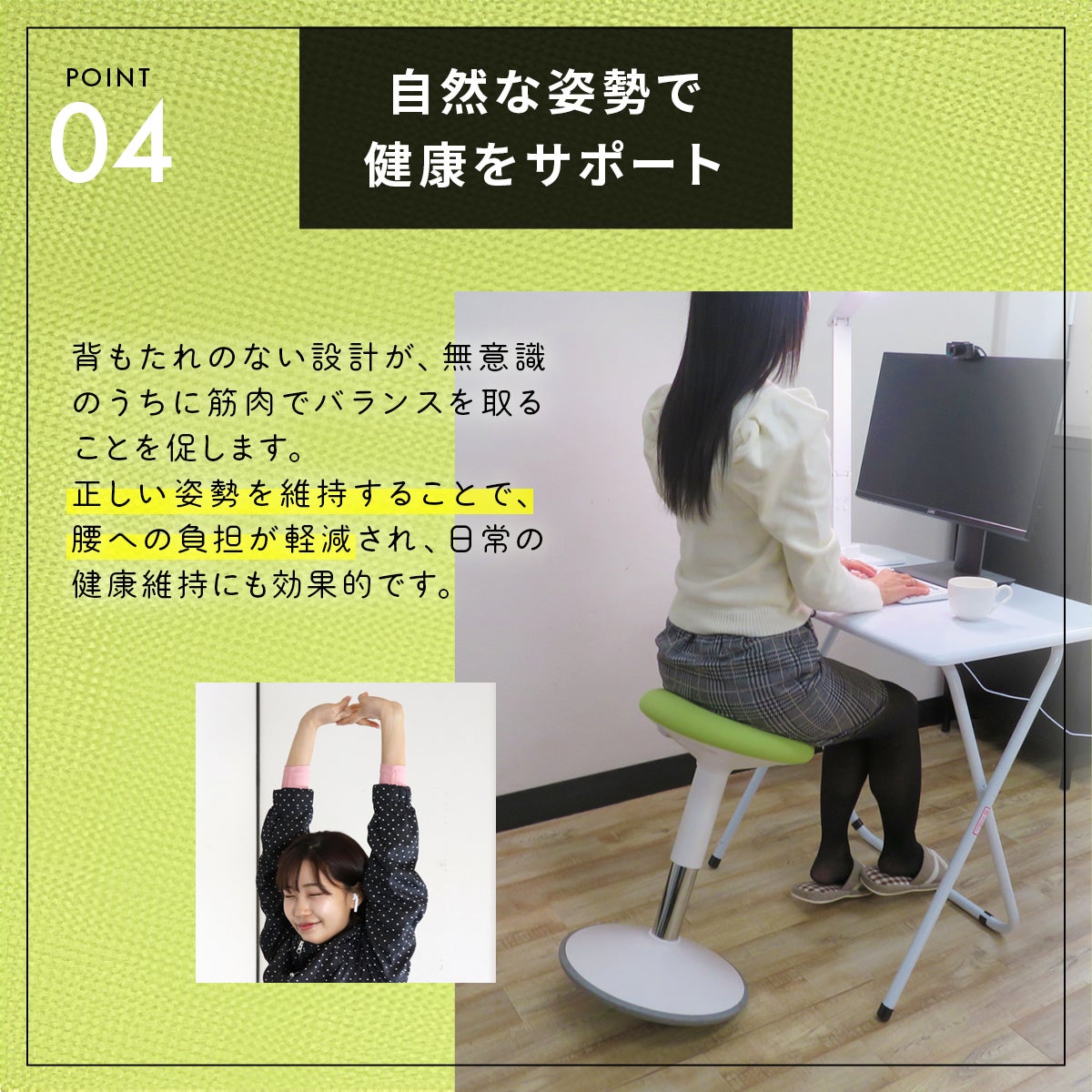 またPCや執筆作業で体を前かがみにならなければならない時でも、座面が動かないオフィスチェアと違い、「グラッチェア」は体の姿勢と共に座面が前に動くため猫背にならず、背骨のS字カーブをキープ。自然と正しい座り姿勢が身に付きます。