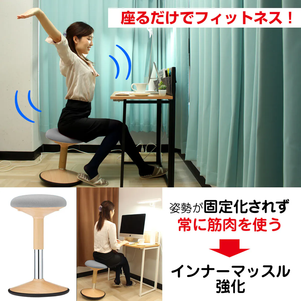 「おきあがりこぼし構造」の「グラッチェア」はフィットネスで使うバランスボールと同じ仕組み。グラグラ触れる椅子でバランスを保って座るには、腹横筋や内腹斜筋、脊柱起立筋、腸腰筋といった背中を支える「体幹筋」を使わなければなりません。