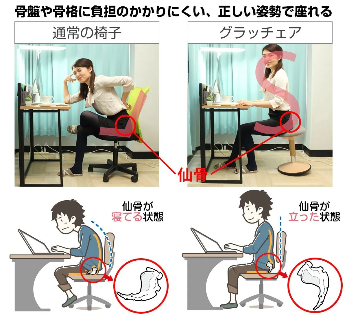 ところが座った姿勢では骨盤の仙骨部分が後ろに傾き、背骨のS字カーブが崩れてL字型に。仙骨は背骨と骨盤を繋ぐ部分で、上半身の重さがダイレクトに仙骨に掛かるため、すぐに仙骨周りの筋肉が硬直してしまいます。