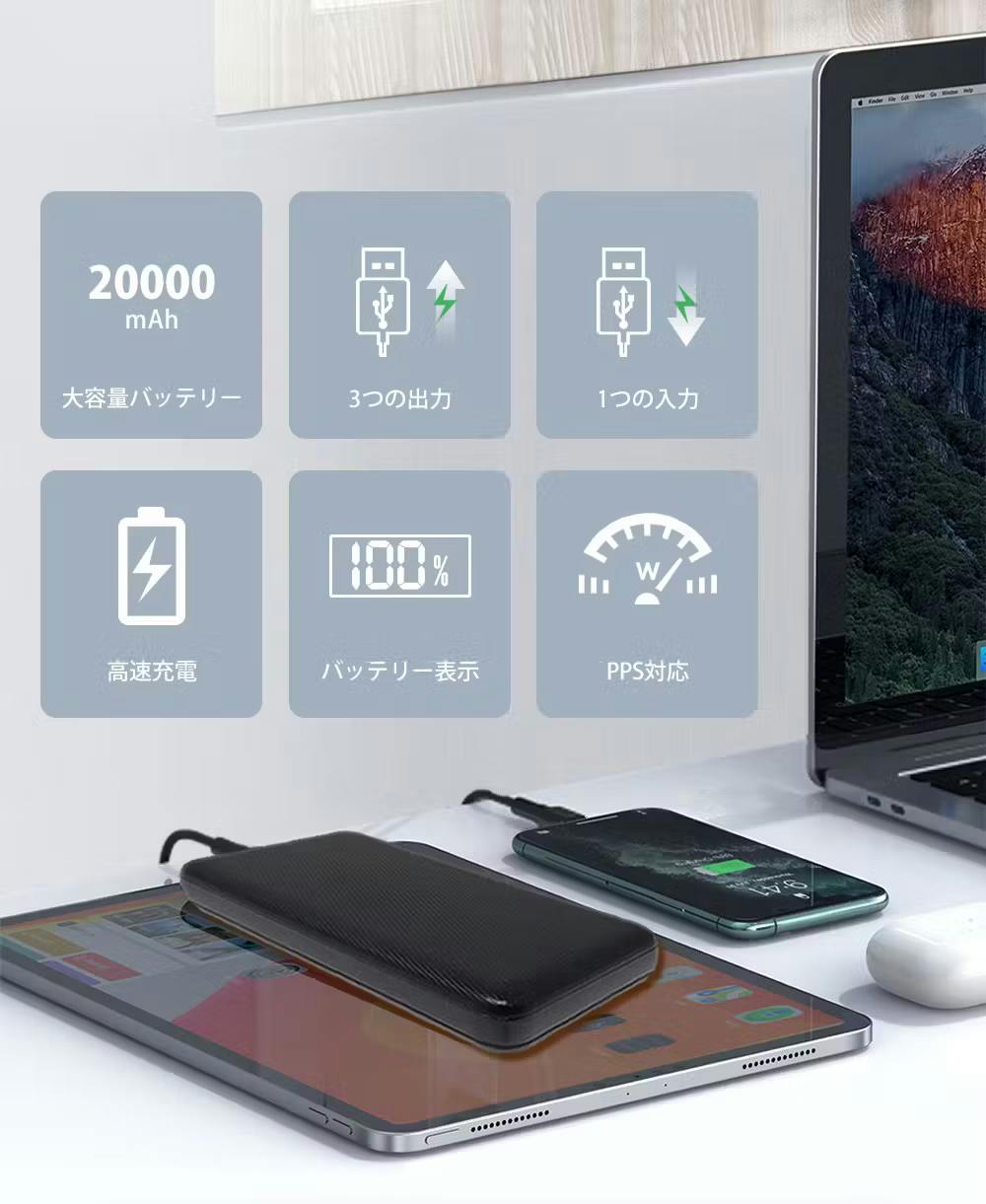 この商品は、SAMSUNG製電池の20000mAhを搭載しており、最大100Wの出力でノートPC、iPhoneやiPad、ゲーム端末、アクションカメラなど、日常で使用する様々な端末を何度も充電することができます。この商品を持っていれば、外出先でも、旅行先でも、いつでもスマートフォンやタブレットを充電することができます。軽量で持ち運びにも最適ですので、仕事や趣味に必要なデバイスが充電切れになる心配もありません。当社のモバイルバッテリーは、高品質な素材と製造技術によって作られた優れた製品です。お客様に満足していただけるよう、常に改良を続けています。この商品は、あなたのライフスタイルに欠かせないアイテムとなることでしょう。