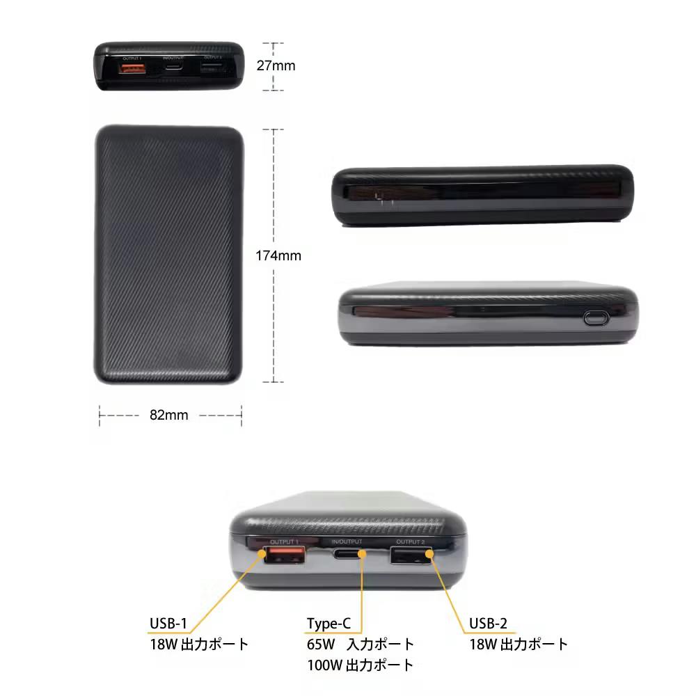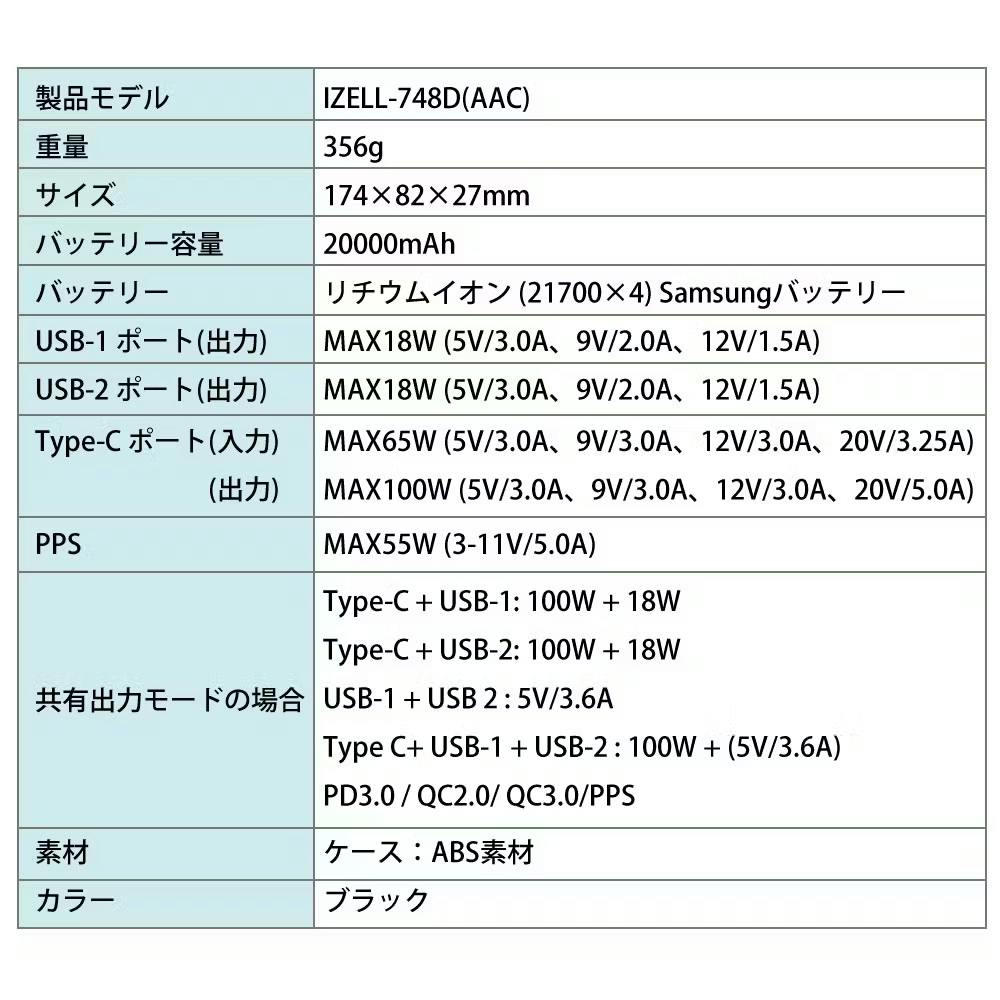 容量 :20000mAh バッテリータイプ:Li-ion (21700*4) Samsung battery Type-C Input: 5V-3.0A,9V-3.0A,12V-3.0A,15V-3.0A,20V-3.25A (65W) Type-C Output 5V-3.0A,9V-3.0A,12V-3.0A,15V-3.0A,20V-5.0A (100W) USB-1: Output 5V-3.0A,9V-2.0A,12V-1.5A,(18W) USB-2 :Output 5V-3.0A,9V-2.0A,12V-1.5A (18W) PPS 3.3-11V / 5.0A (55W)