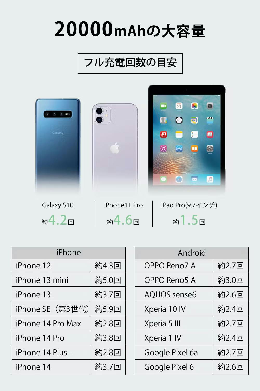 このモバイルバッテリーは、20,000mAhの大容量バッテリーを搭載し、1つでほとんどのデバイスの充電が完了します。