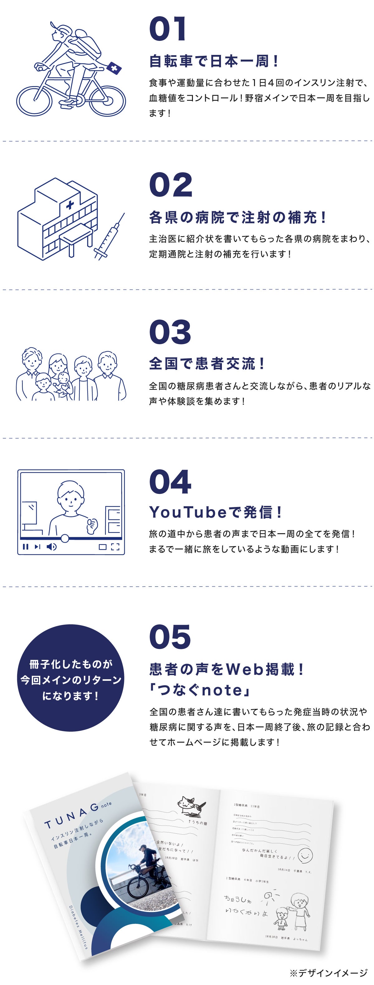 1型糖尿病患者が自転車で日本一周をしようとすると様々な問題が出てきます。その全てを乗り越えながら本プロジェクトを達成出来たのであれば、糖尿病に限らず様々な病気でつらい思いをしている方々に、少しでも希望を与えられると思っております。この壮大なプロジェクトを成功させるため、どうか皆様のお力をお貸しください!