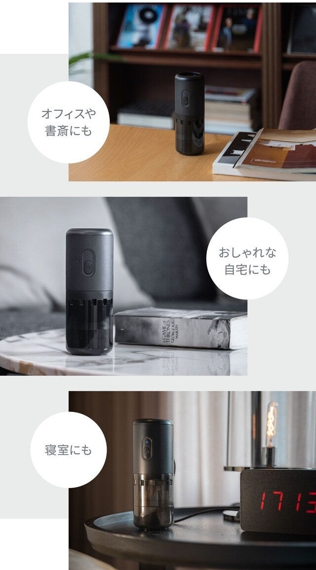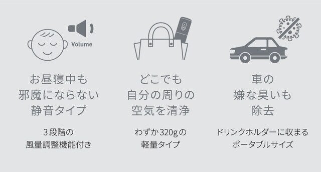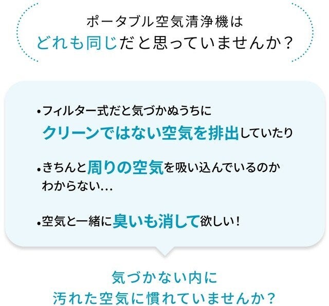 そこから365日持ち運べる空気清浄機を探しましたが、フィルター式は使っている内に性能が落ちる上フィルターが高価で経済的負担が重いです。また性能が良ければよいほど大きいものが多いため、従来の除菌方式では自分の悩みは解消できないと思ったのがポータブル空気清浄機を探し始めたきっかけでした。