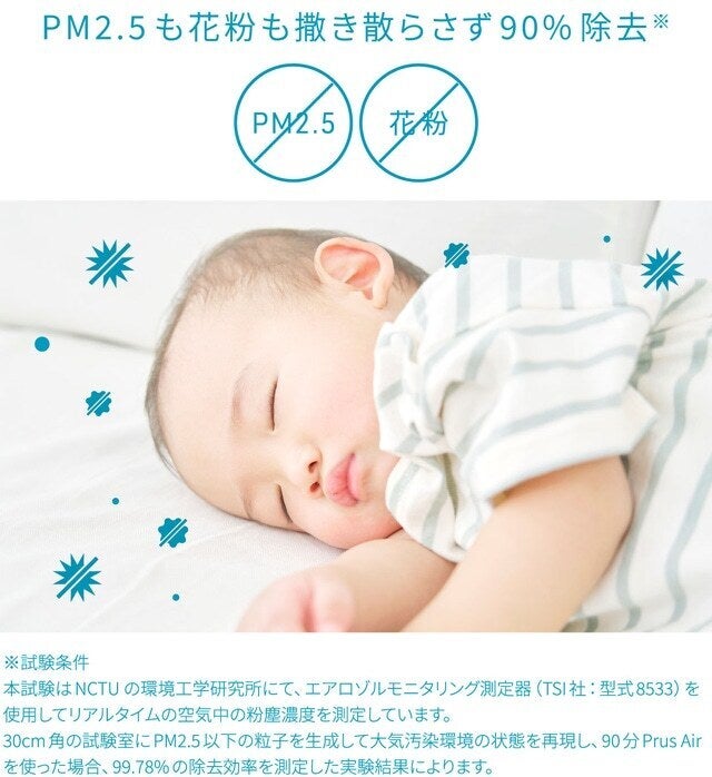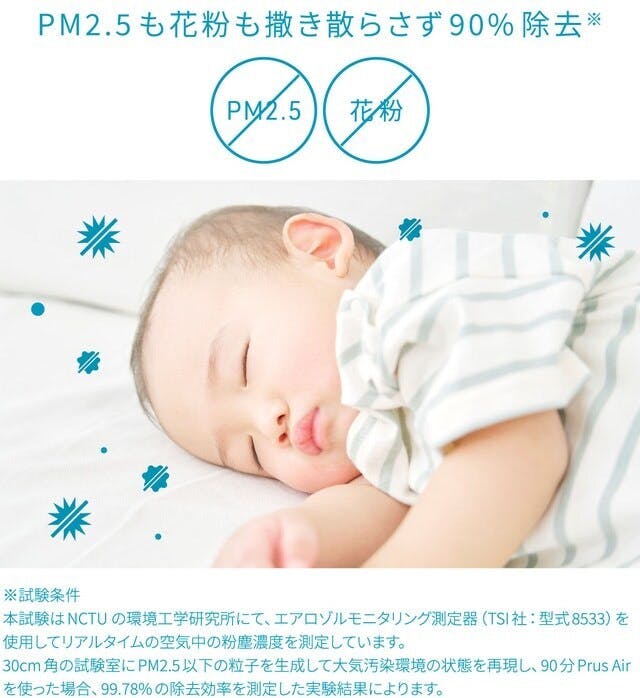 粉塵除去:30cm書くの試験室にPM2.5以下の粒子を生成して大気汚染環境の状態を再現し、90分本商品を使った場合、99.78%の除去効果あり