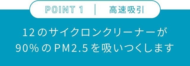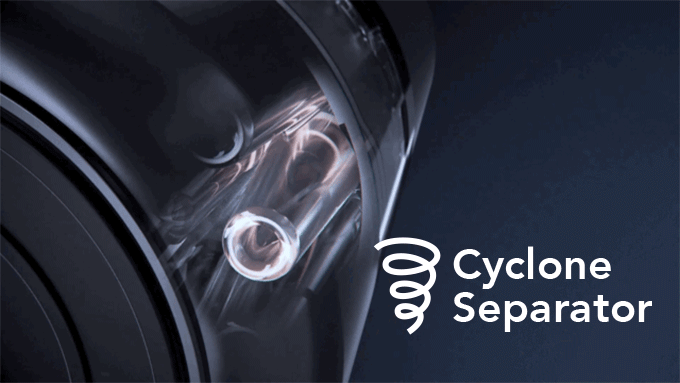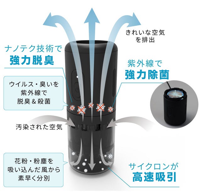 「フィルターレスサイクロン構造」で、遠心力により塵など大きい粒子はダストボックスへ、粒子サイズの小さい有害物質は、 ナノモレキュラーシーブの結晶に閉じ込められた後UV-A,UV-C紫外線により除菌されます。