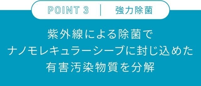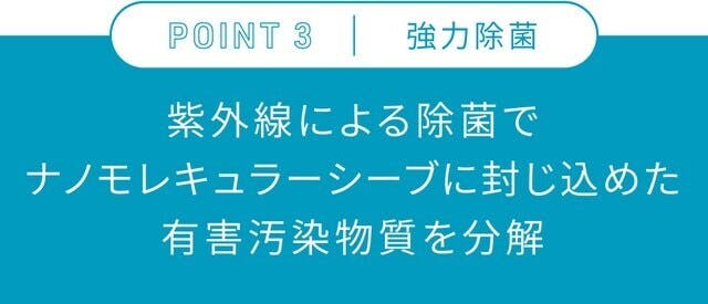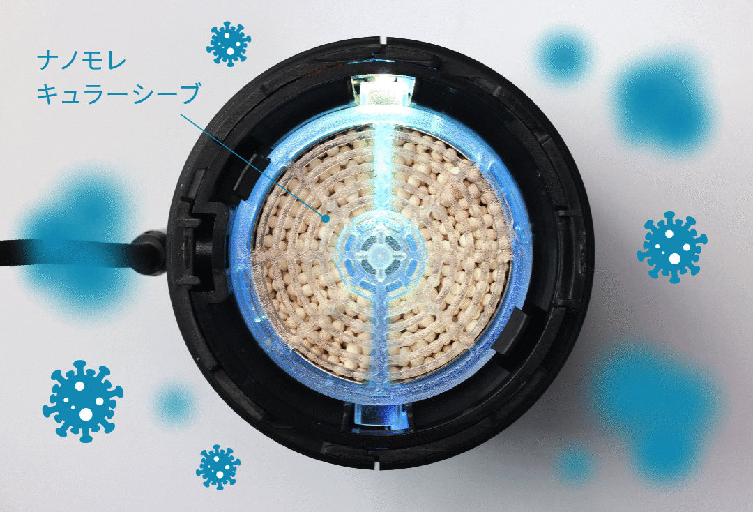「ナノモレキュラーシーブ」に吸着された細菌やウイルスは「紫外線の力」で除菌されます。