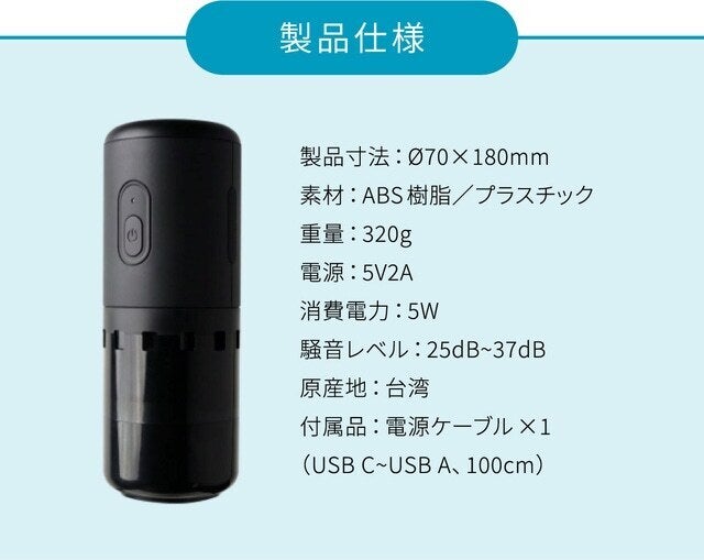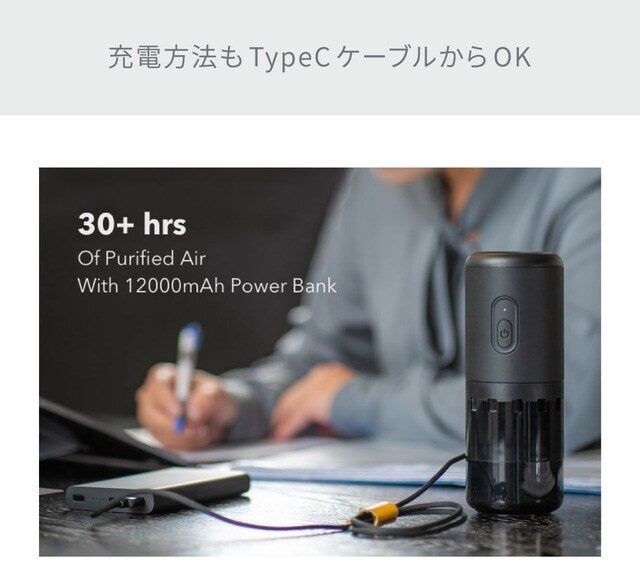 また消費電力も最小限に抑えるため、12,000mAhの容量のバッテリーを使用すると、最大30時間きれいな空気を供給できます。※バッテリーは内蔵していないので、スマホを充電したり本体のみで起動することはできません。