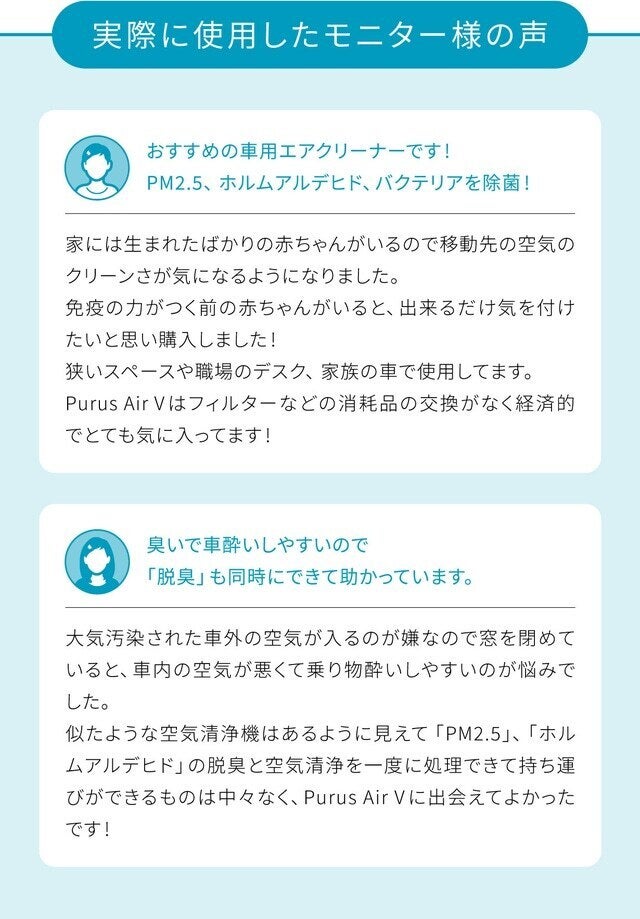 車社会やビルが集中した都市が多くある日本では大活躍する空気清浄機だと思います。ぜひ、この機会に手に入れて「自分」や「自分の大切なもの」の空気をクリーンに保って笑顔で暮らして頂く助けになれればと思っております。