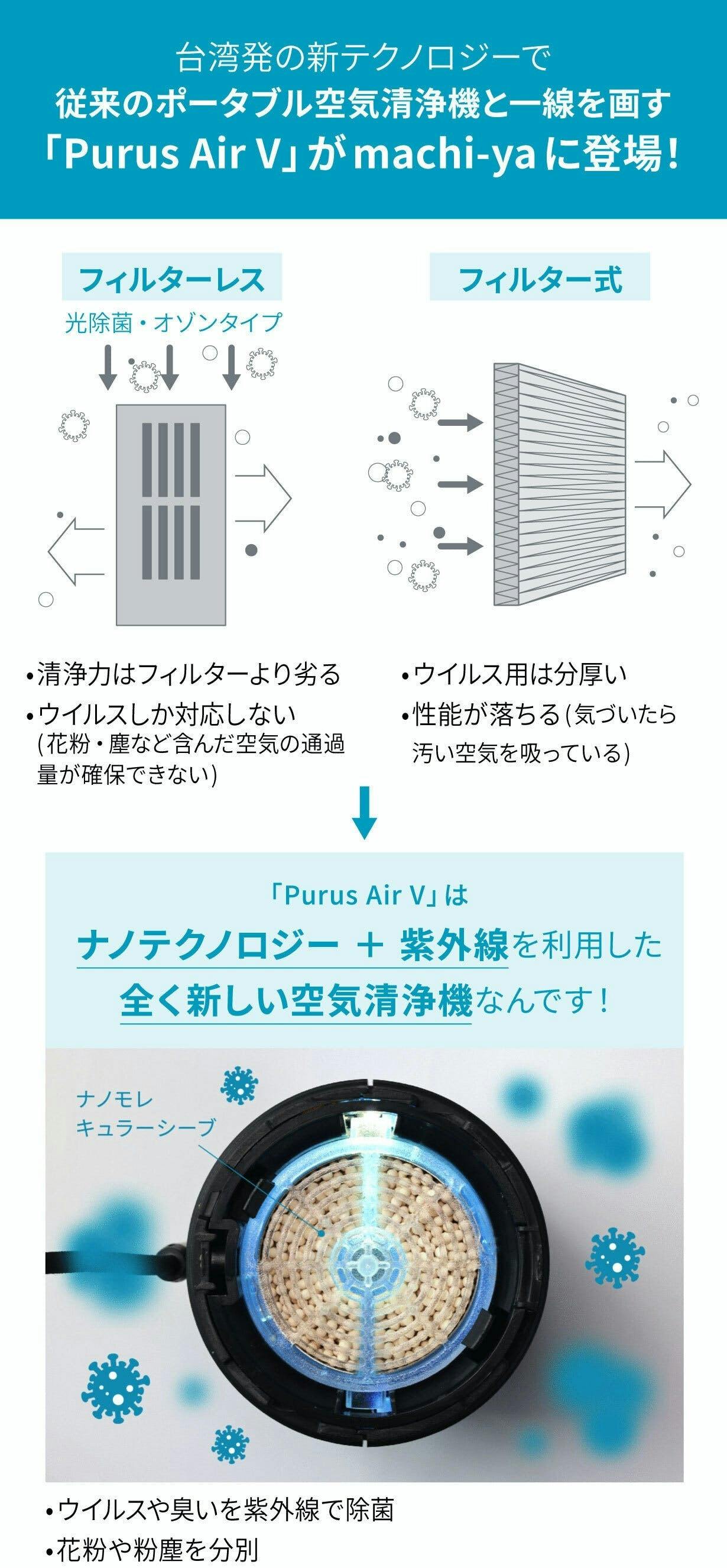 「Purus Air V」はナノテク技術と紫外線による除菌技術を組み合わせる事で「フィルターレス」「除菌・消臭※」までポータブルサイズでできる新しい方式の「空気清浄機」です。