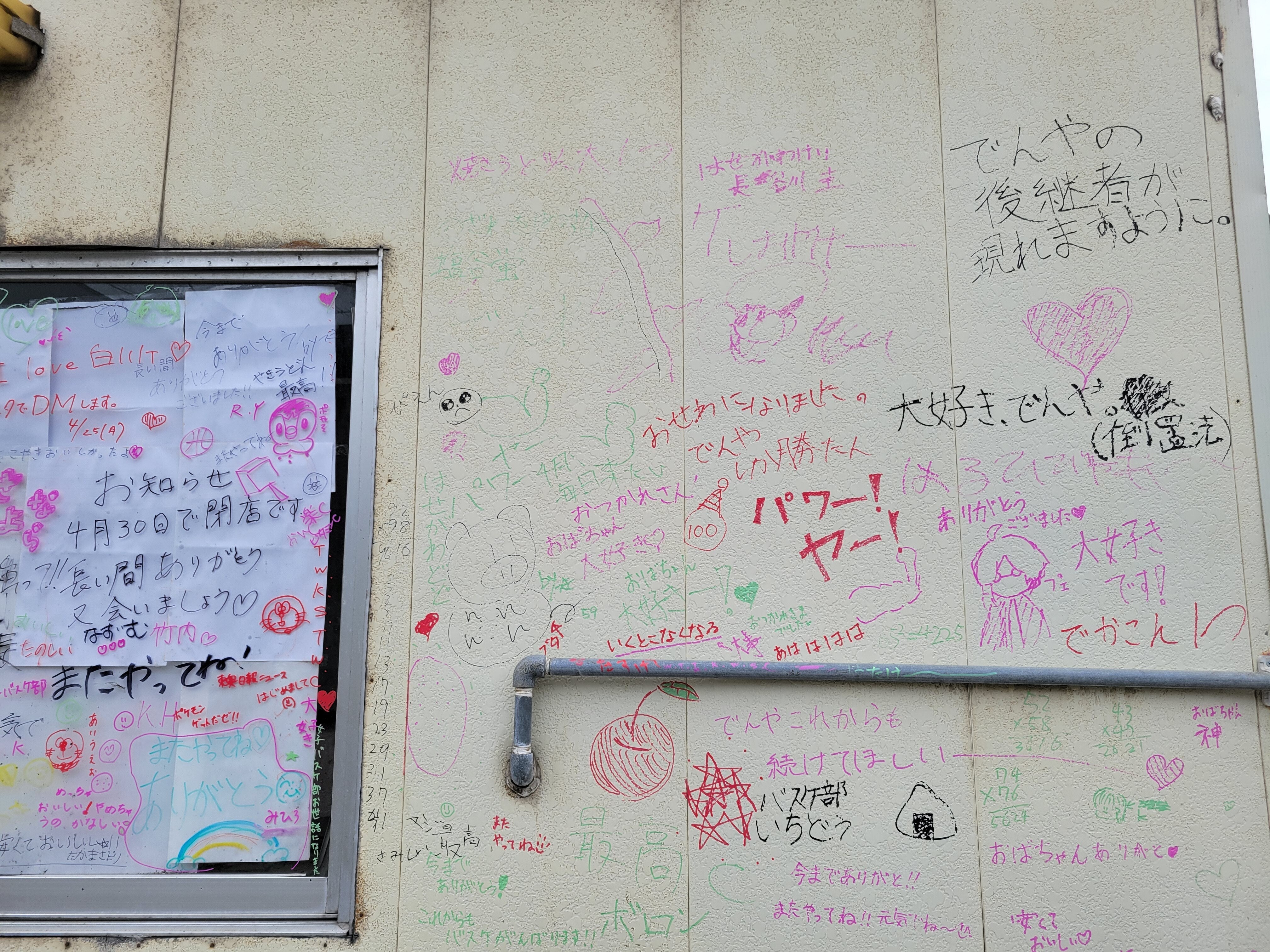 子どもたちの寄せ書きと光に見守られ閉店を迎えたでんや(2022年春)