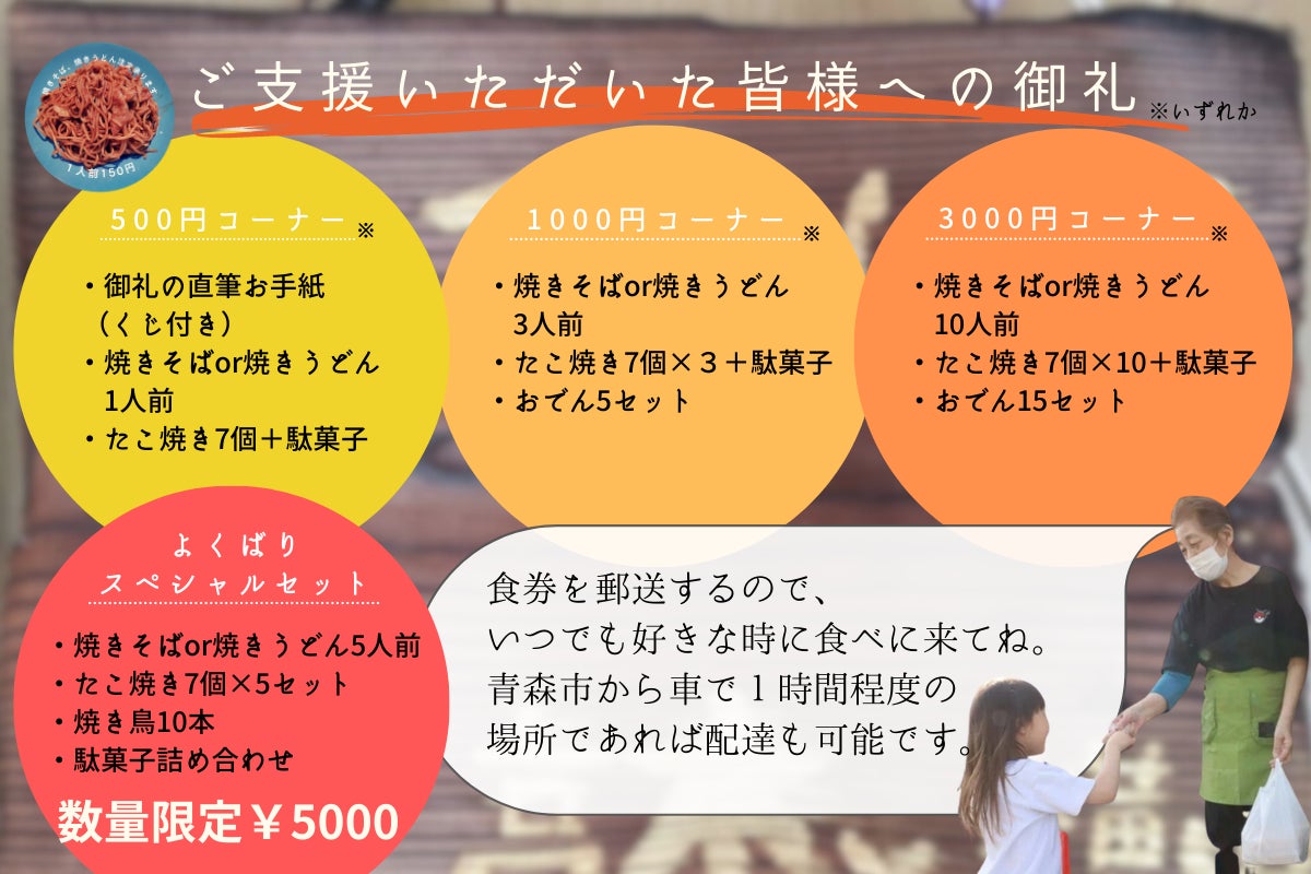 ◆御礼・特典:御礼のお手紙・活動報告送付・駄菓子セット・総菜などを準備しております。