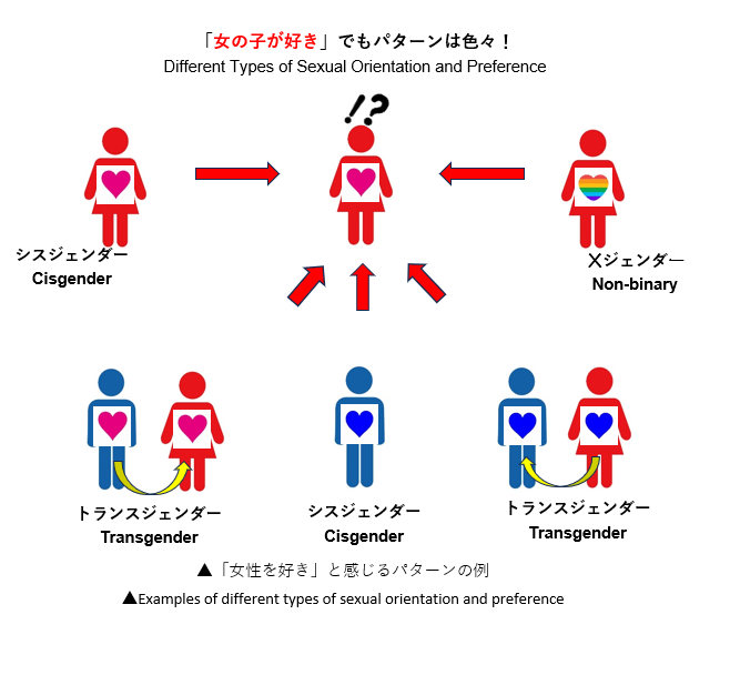 例えば、図のように「女性が女性を好きになる」という場合でも、人によって相手を恋愛対象として見る方法は異なります。「①体も心も女性で、同性として女性が好き」「②体は女性だけど心は男性で、異性として女性が好き」「③体は女性だけど心は男女両方で、異性として(または同性として)女性が好き」などのパターンが存在します。
