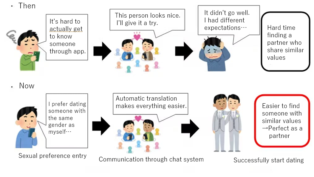 LGBT people have a wide variety of gender identities, body types, and sexual orientations, and the values and perspectives they seek in a partner differ from person to person. For this reason, although there are LGBT matching services, most of them provide only the profile information that is described in general matching services, making it difficult to find a partner whose values and sexuality match one's own views on love.