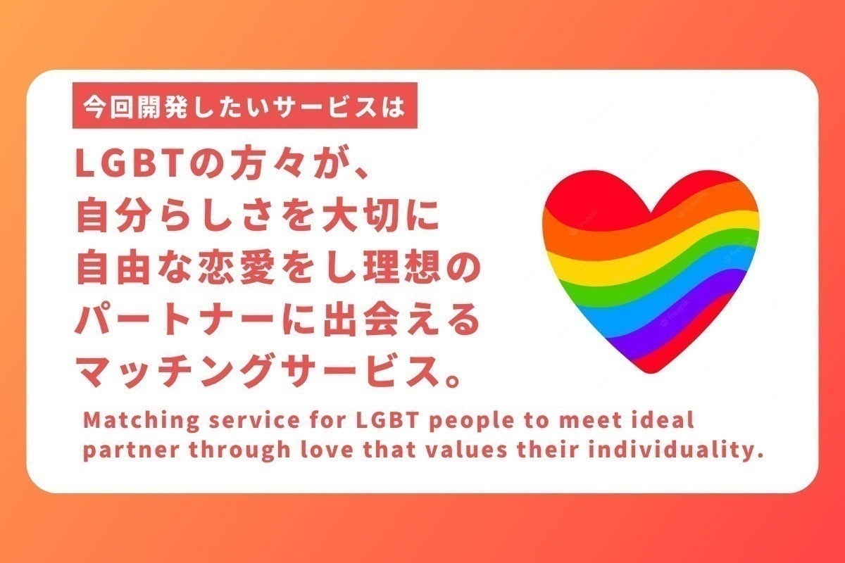 To provide domestic and international marriage counseling services for LGBT people in Japan. Unlike general matching services that already exist, the service will be open to users from overseas, and will enable matching that includes physical sex, mental sex, and romantic interests.
