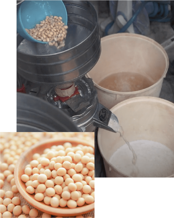 マメソメの型染めにかかせない、顔料の定着材として使用する大豆のしぼり汁(呉汁)。たんぱく質が固まる性質を利用して色を定着させていきます。