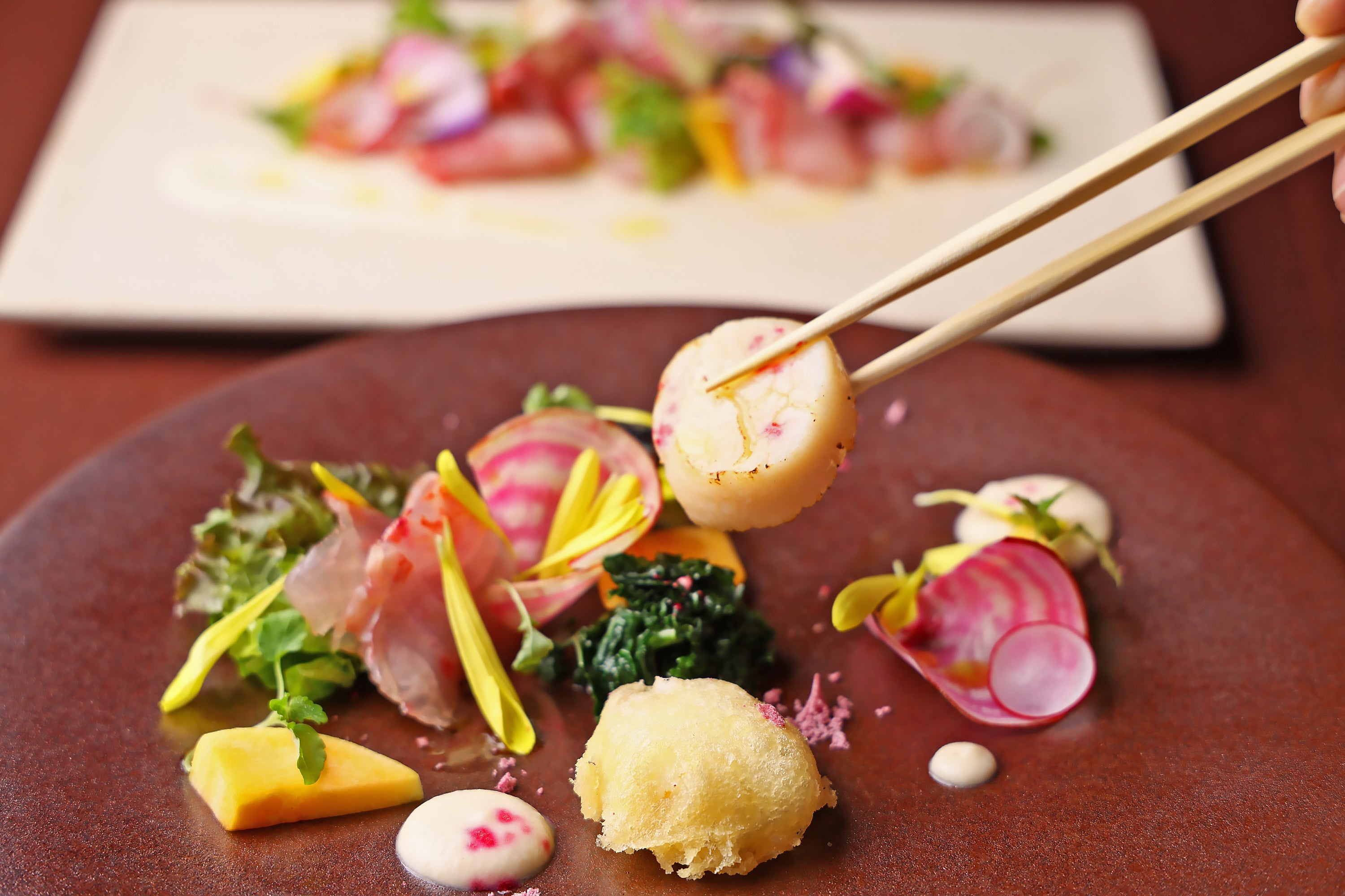 同じ伏見のパートナー、齊藤酒造(日本酒「英勲」)、宮本ファーム(地野菜と米)マルトシ珈琲(オリジナルブレンド)、カネ七畠山製茶(抹茶ほうじ茶宇治茶等)といったこだわりの地域素材を京都伏見出身の山本料理長が季節の一皿としてご提供しています。フレンチでありながら利尻昆布の和出汁、酒粕、醪、味醂、味噌など和の要素を取り入れたお箸で食べる京フレンチとして地元やグルメなお客様でたくさんのご予約を頂戴しております。