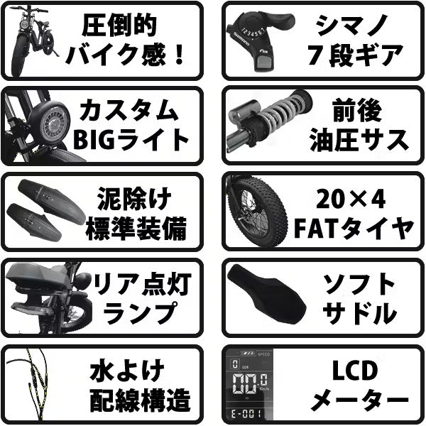 極太タイヤとゴツいフレームが、ワイルドでダイナミックな雰囲気を醸し出す、電動アシスト自転車をご紹介します。シマノ7段ギア、5段階アシスト、350Wのブラシレスハイパワーモーターを搭載し、スピードや坂道をラクラクこなせます。加えて、前後サスペンションや泥除けを標準装備しているため、どんな地形でも快適!