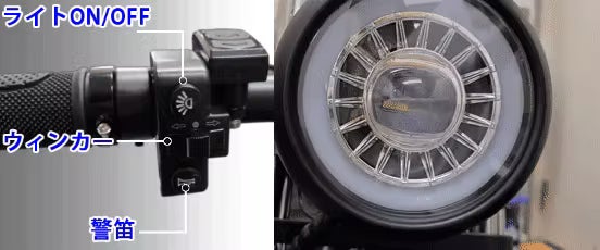 AWB01のヘッドライトは、バイクに使用されるヘッドライトをカスタマイズして搭載しています。
