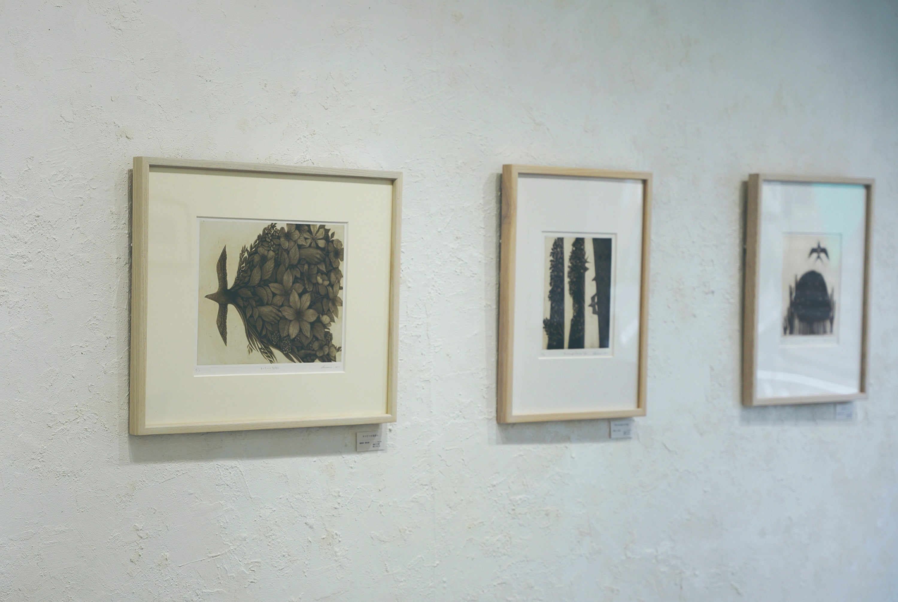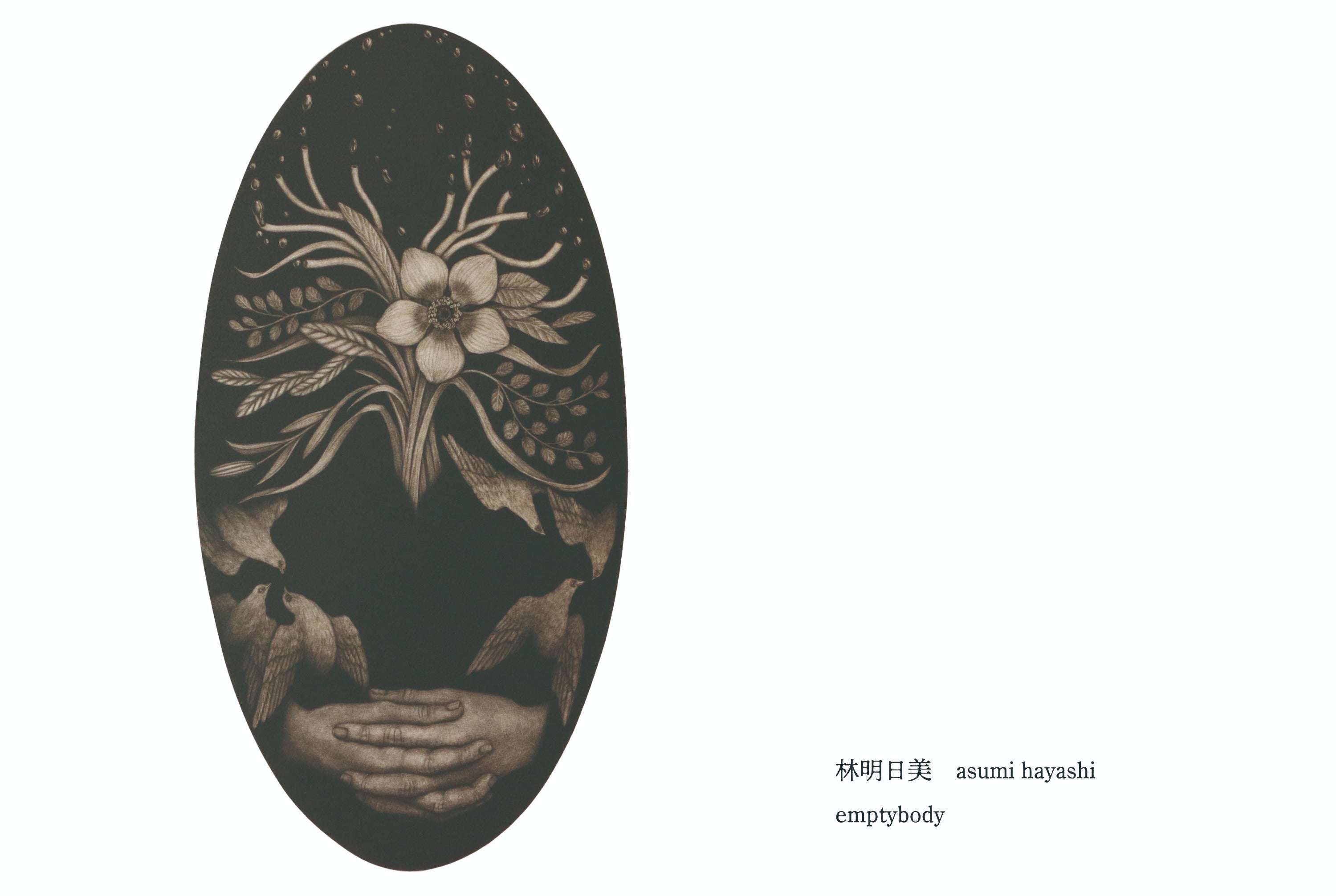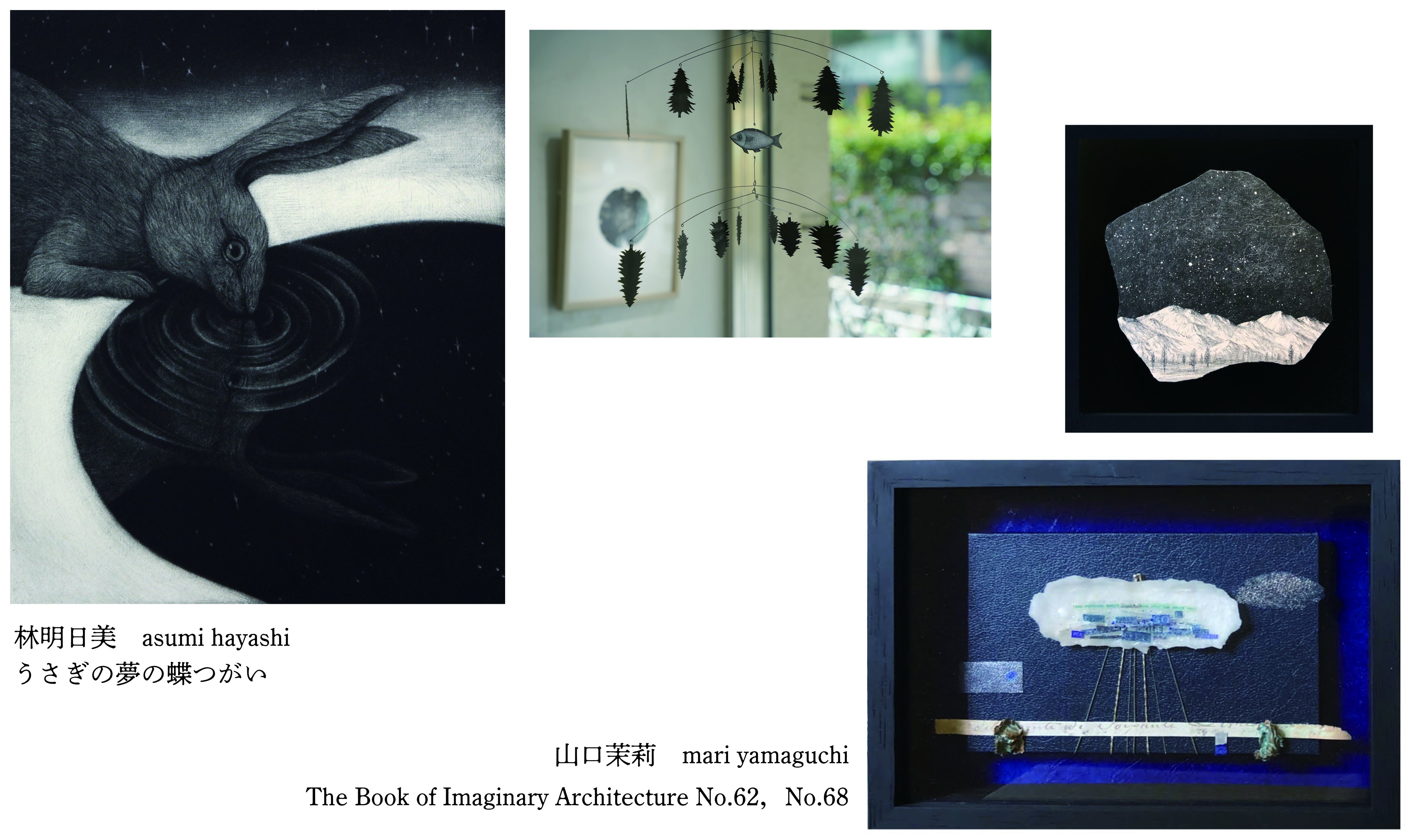 今回の展示では、メゾチント技法独特の黒の世界を楽しんでいただき、その様々な黒の中で思考の旅を楽しんでいただければ幸いです。(林明日美)