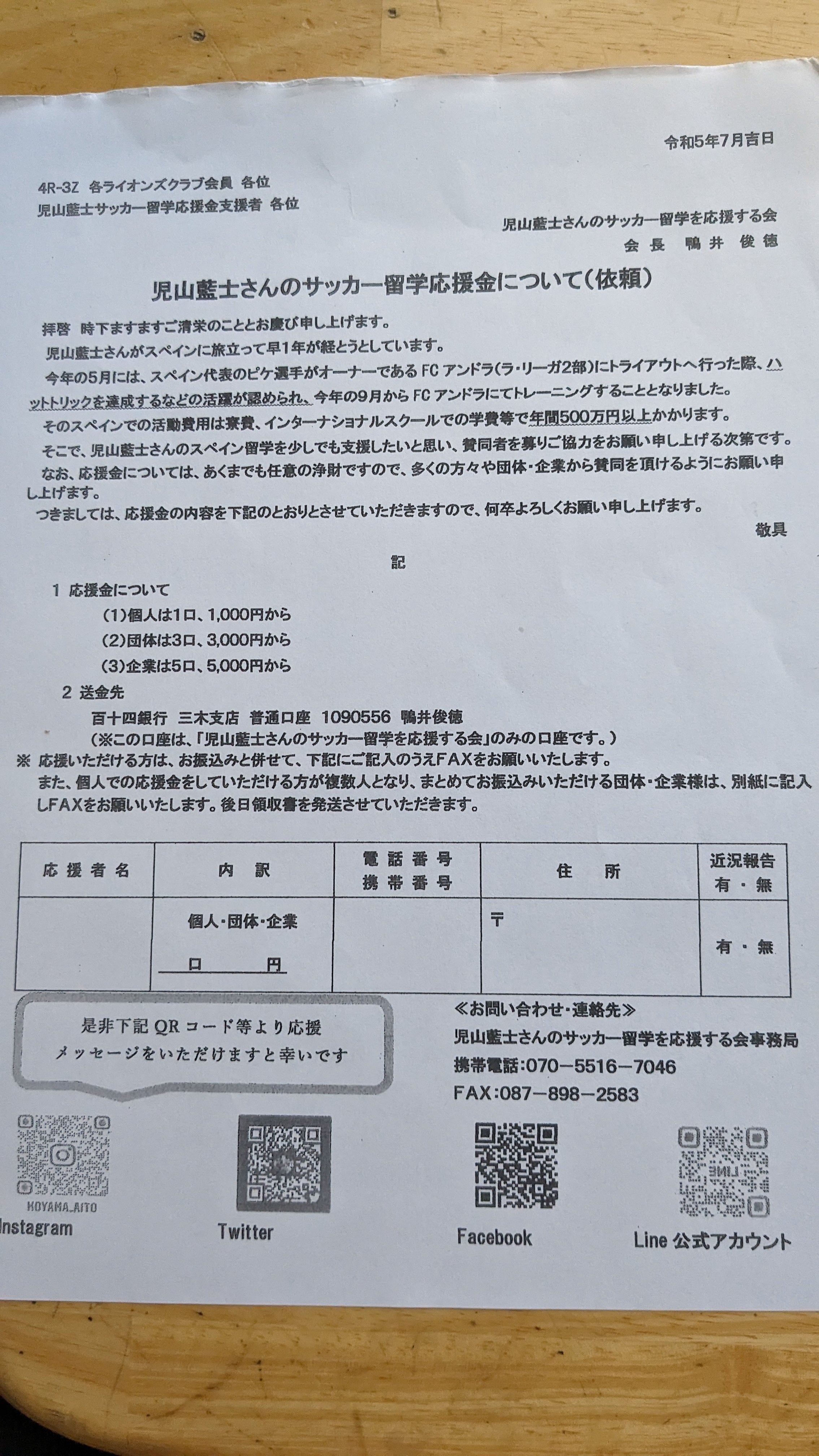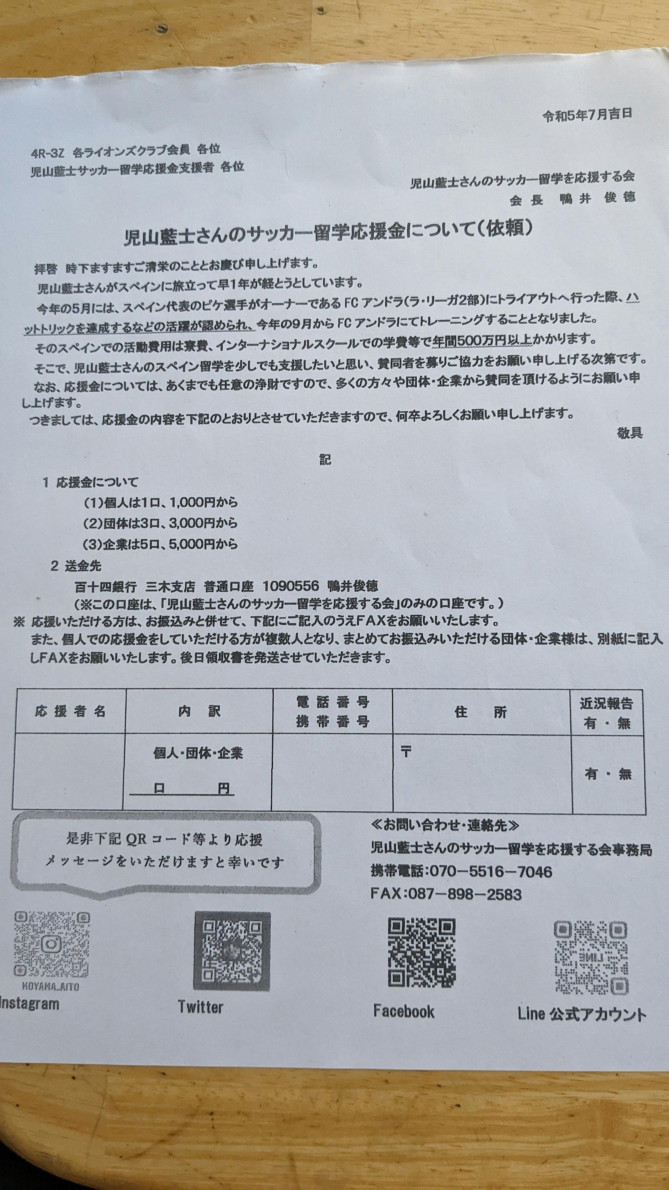 児山藍士さんのサッカー留学を応援する会事務局よりお知らせです。