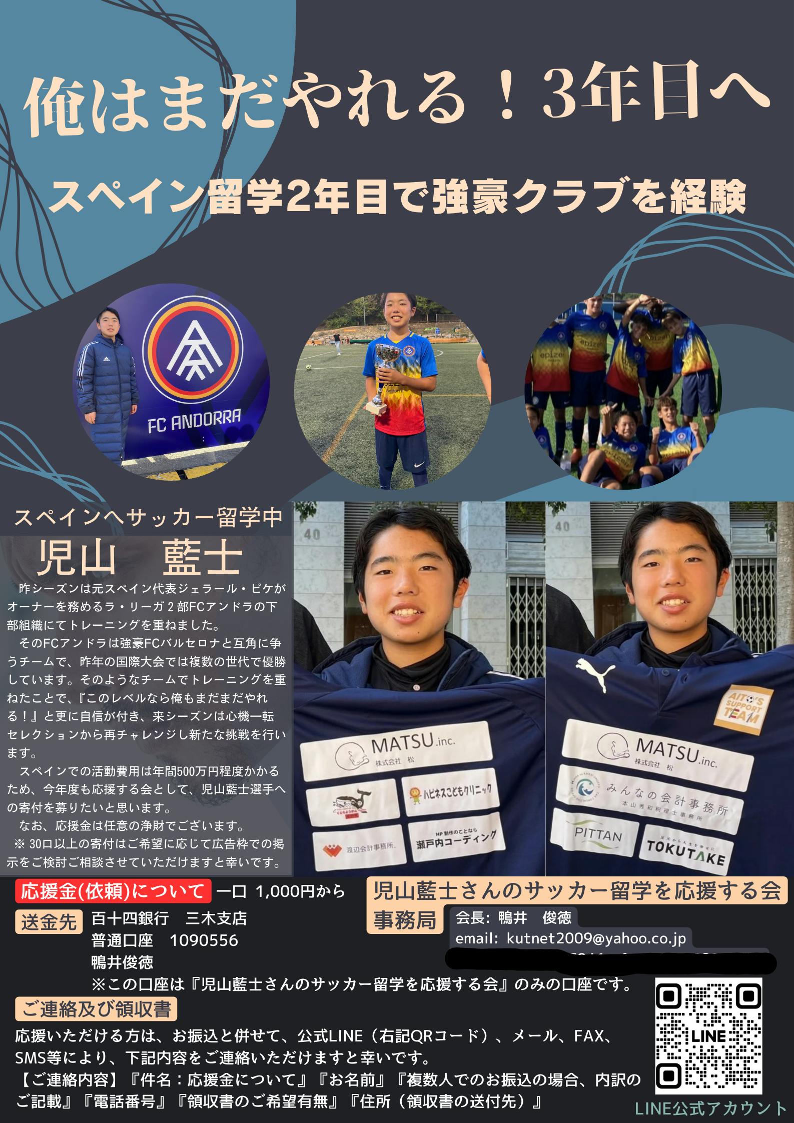 いつもお世話になっております。児山藍士ですが、只今スペインから一時帰国しており、8月上旬まで滞在しております。そんな中、四国新聞社様が藍士の活動を記事に掲載してくださいましたので、是非ご覧いただけますと幸いです。また、記事にありました応援金につきましては、画像にて詳細を添付しましたので、是非ご覧いただけますと幸いです。