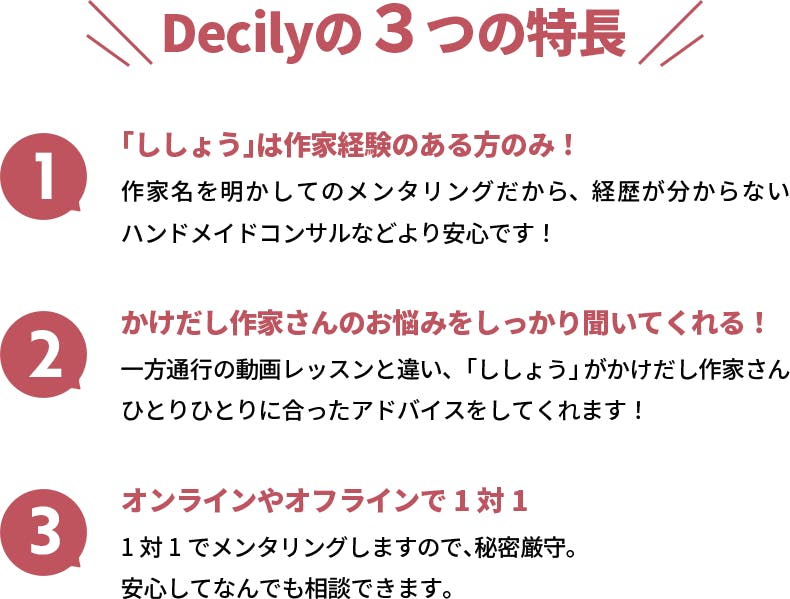 初心者さんがあこがれの「ししょう(ベテラン作家)」に「でしいり」し、マンツーマンでサポートを受けられるwebメンタリングコミュニティ「Decily -デシリィ-」を提供いたします。