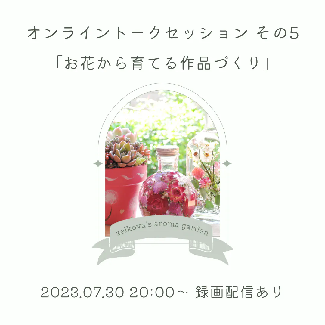 2023/07/26 16:197/30のオンライントークセッションの内容ご紹介その5です。今日ご紹介するのはzelkova’s aroma gardenさん。zelkova’s aroma gardenのゆうこ先生は、心をこめて育てたお花でとても美しいドライフラワーを作られています。ただ乾かすだけでなく、お花の種類によって押し花にしたり埋めたり干したりと様々な方法を使い分けて花材を作っていらっしゃるんですよ。二人のお子さんを育てられているお母さんとして、毎日のくらしを大切にしながらご自分のペースで向き合われているゆうこ先生には、私も学ぶところが多いです。今回は「お花から育てる作品づくり」についてお話いただきます。楽しみにしていてくださいね! もっと見る