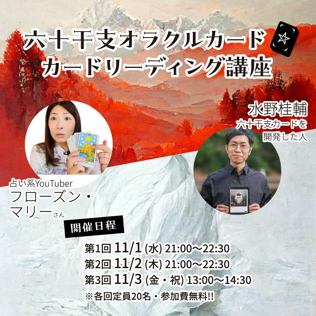 2023/10/25 16:27こんにちは69Artの水野桂輔です!その節は、クラウドファンディングで多くのご支援をありがとうございました。皆様のおかげでグッズの商品化、ネットショップの立ち上げができましたこと、感謝申し上げます。さて、クラウドファンディングでも最も人気のあったのが(支援者数150人!)、六十干支をタロットカード風にした「六十干支オラクルカード」でした。たびたび、このカードをどのように使うのか、カードリーディングの講座を開いて欲しいです!というお声をいただくのですが、なんとコラボという形で実現することになりました!ひょんなことからご縁のあった、人気YouTuberフローズン・マリーさんをスペシャルゲストに招いてカードリーディング講座を開催します!六十干支オラクルカードの使い方を学びたい方、ぜひご参加くださいませ。***講座は実践型ですので、その場でカードリーディングを行いながら進めます。「六十干支オラクルカード」をお持ちでない方は、購入して手元にある状態でのご参加をオススメします。購入は69Artオンラインショップから⤵https://shop.69art.jp/items/78242801***講座開催にあたり、特別クーポンをご用意しました!※講座参加者さま向けのクーポンです。《マリーさんコラボクーポン》クーポン特典:六十干支オラクルカード 10%OFF!※「六十干支オラクルカード」単品、「六十干支オラクルカード+メッセージBOOK」セットにご利用いただけますクーポンコード:FROZEN-MARY-33有効期限:2024年3月31日まで使用方法:ショッピングカート画面で、上記のクーポンコードを入力ください。注意事項:クーポンの使用は1回1枚のみ、クーポンの併用はできません。ご利用はおひとり様1回限りです。***※六十干支オラクルカードをお持ちでなくてもご参加はできます。--------------------人気YouTuberフローズン・マリーさんコラボ☆六十干支オラクルカードを使ったカードリーディング講座◎スペシャルゲスト:フローズン・マリーさん小学生の時からはじめてタロット歴35年、占い師歴15年、占い系YouTuberの先駆け。チャンネル登録者数 のべ8万人。今までに10万人以上を鑑定し、様々な背景を持つ人の心に触れる。現在は、カードカウンセラーを目指す方への講座に力を入れている。メインチャンネル https://www.youtube.com/@frozenmaryセカンドチャンネル https://www.youtube.com/channel/UCKFEg9e3RqB8eS6J6HreExQ◎ファシリテーター:宿命鑑定師/69Artデザイナー 水野桂輔宿命を飾ろう。69Art ロクキューアートオンラインショップ:https://shop.69art.jp/講座の内容:水野より・六十干支オラクルカードの説明・制作の意図や想いマリーさんより・カードリーディングのレクチャー・カードリーディング実演開催日時:・第1回 11/1(水) 21:00~22:30・第2回 11/2(木) 21:00~22:30・第3回 11/3(金・祝) 13:00~14:30※各回同じ内容ですが、複数回ご参加いただいてもOKです。※Zoomでのオンライン開催です。(お申し込みいただいた方に、入室URLをご連絡します)定員:各回20名(先着順)参加費:無料お申し込み:以下のメールフォームより必要事項を送信ください。↓↓↓https://forms.gle/7k1B3cVFekAiep8MA主催者:水野桂輔--------------------六十干支オラクルカードの活用方法や、マリーさんのカードリーディング手法に興味のある方のご参加をお待ちしております! もっと見る