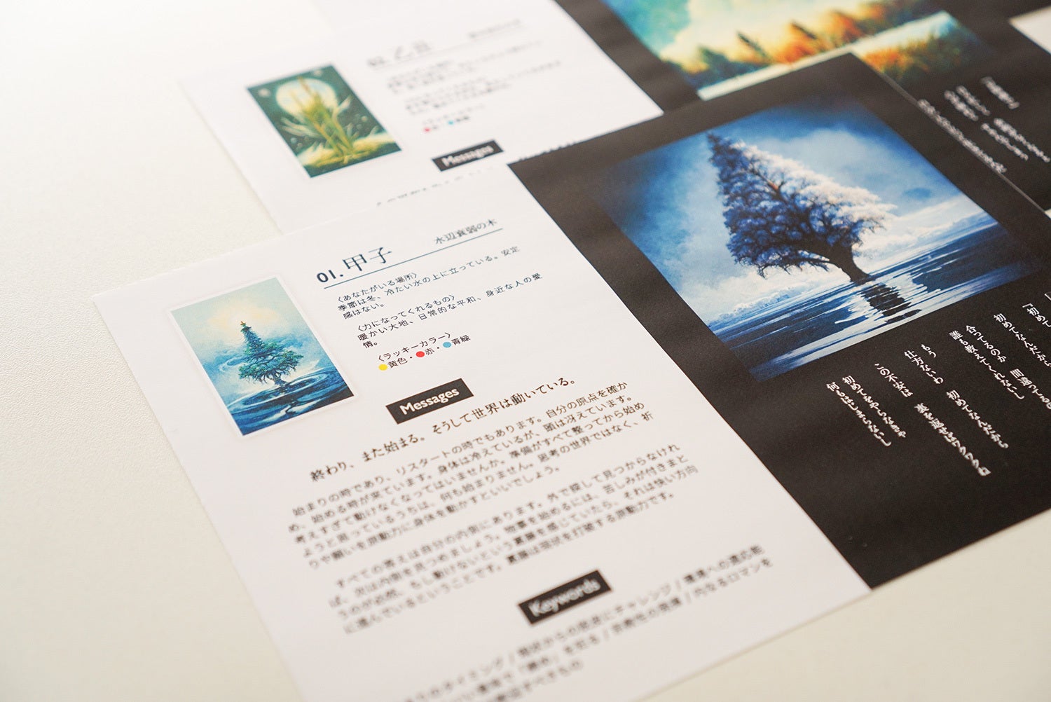 1つの干支につき見開きで、メッセージとアートを掲載していきます。干支は60個ありますので全120ページ、+αで使い方等を掲載予定です。六十干支タロットカードと合わせることで、カード占いにも使えるかと思います。