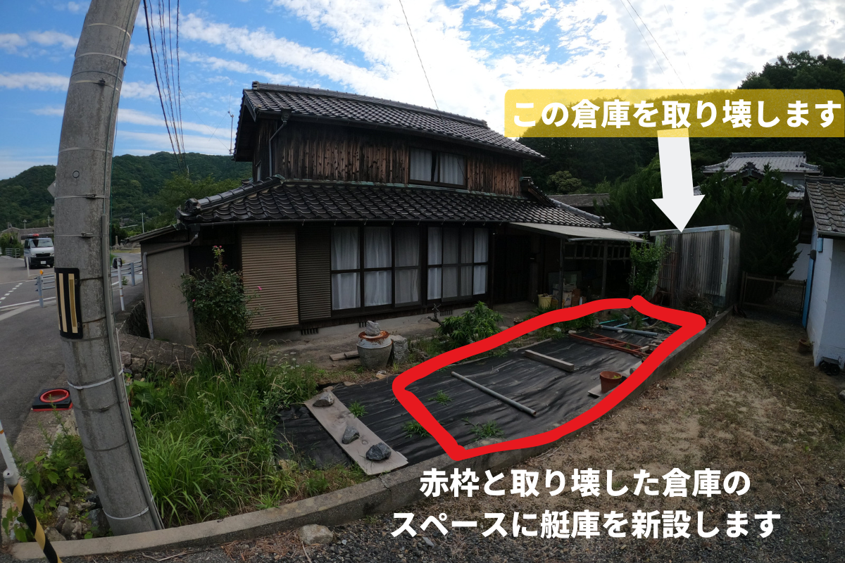民家の前のスペースには老朽化した倉庫があります、これを解体して艇庫を新設しようと思います。