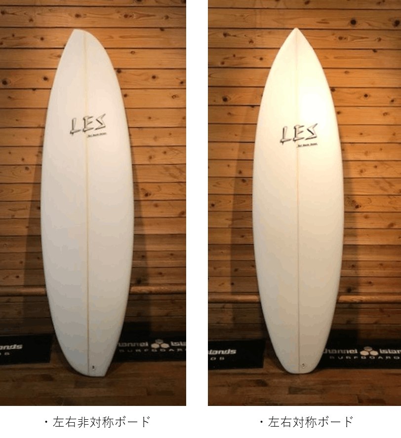す。右側に割れる波に乗った場合、ボードの右側だけが波の面に接しています。同様に左側に割れる波に乗った場合、ボードの左側だけが波の面に接しています。つまり、左右対称のボードデザインにする必要はなく、ライダーの個性や乗り方によって左右のボードデザインを変える必要があります。自分でもこれまで3本の左右非対称のサーフボードを作りテストしました。左右対称のボードとは全く違う形なので乗り味に違和感があると思っていましたが、全く違和感なく乗ることができ、むしろ左右対称のボードよりも乗りやすかったです。