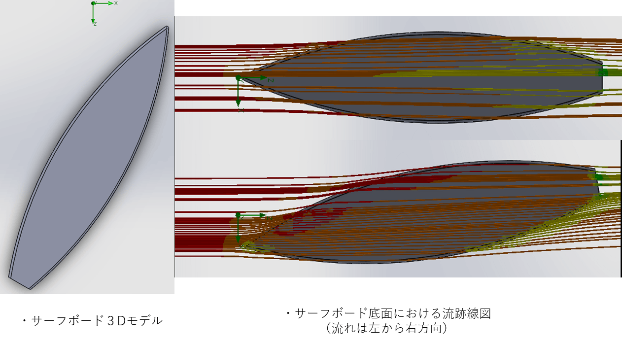 サーフボード周りの基本的な流れを把握するために、ロッカーの無い平面状のサーフボードを作成し、底面にコンケイブがある場合と無い場合について、水中にサーフボードを入れた状態での流れ解析を行いました。流れ解析によりサーフボード底面の流跡線を求め、サーフボード底面のコンケイブがフィンと同じような効果を発揮することが分かりました。