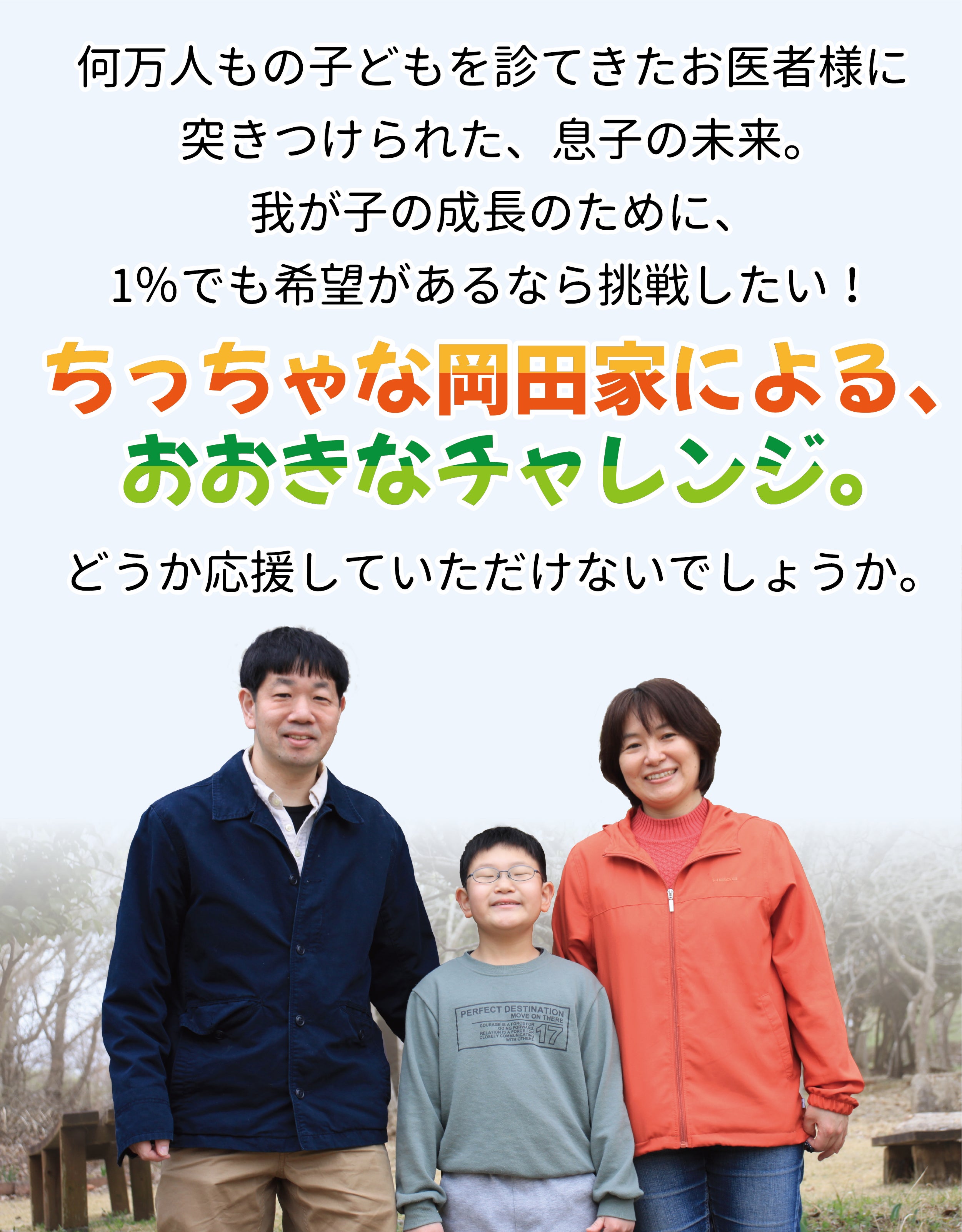 2025/04/26 09:002023年5月に、クラウドファンディングを、行なわせていただきました。ご支援者様のおかげで、治療継続を出来ており、大変感謝を申し上げます。医師の見解によると、治療の効果は最低でも3年との事です。また、毎月20万の治療費がかかっており、医療ローンを組んで治療費を工面している現状です。ご支援者様には、再度のお願いで大変心苦しいと思っています。大切な1人息子です。もう一度、治療継続の機会をいただけたら幸いです。2025年4月26日(土)9:00公開となります。お忙しい所、ご一読いただけたら嬉しいです。どうぞ宜しくお願い致します。https://camp-fire.jp/projects/829422/view?utm_campaign=cp_po_share_c_msg_mypage_projects_show もっと見る