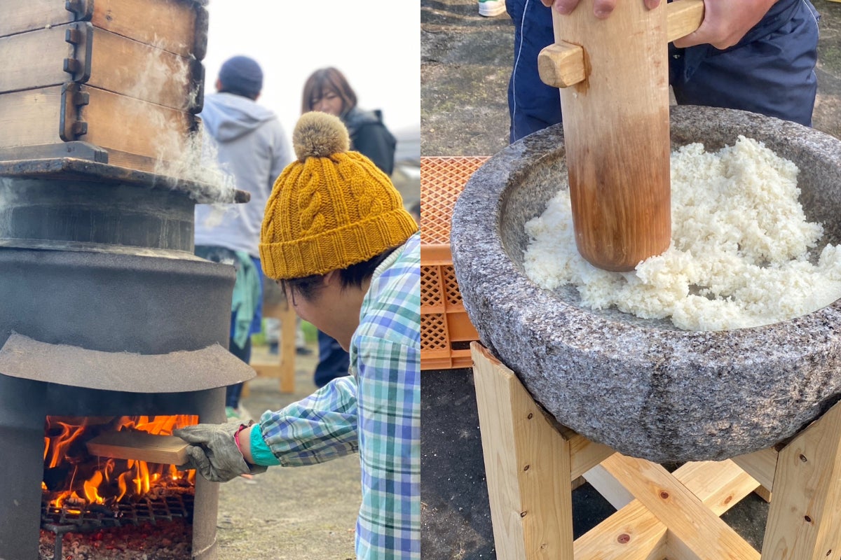 介取りさんと息を合わせて、ぺったんぺったん。最初は少し米粒が飛び散ることも。