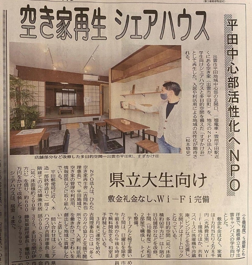 私たちは【空き家を手段に地域をもっと元気にしよう!!】をモットーに島根県出雲市平田地域で活動しているNPO法人ひらた空き家再生舎と申します!!