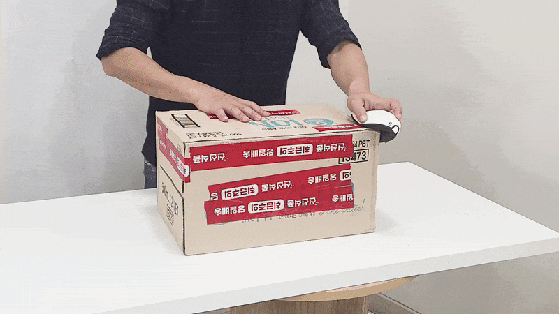Catnailを段ボールの角に押し当てて、ボタンを押してそのままスライドさせれば角のガムテープの切断も超スムーズ。