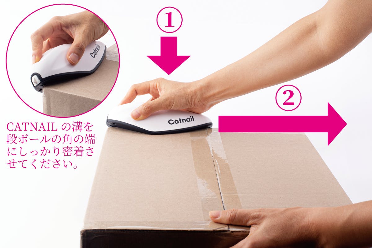 ボタンを押して刃を出し、段ボールの角の端にCatnailがピタッとはまるように押し当て、そのまま最後までスライドしてください。