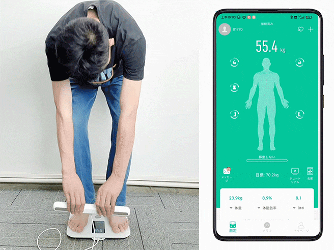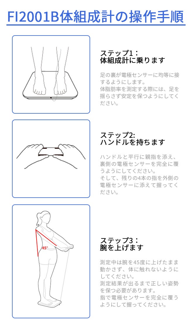 ・激しい運動をした直後に測定すると、体組成計データが正しく表示されない場合があります。必ず落ち着いた状態で使用してください。