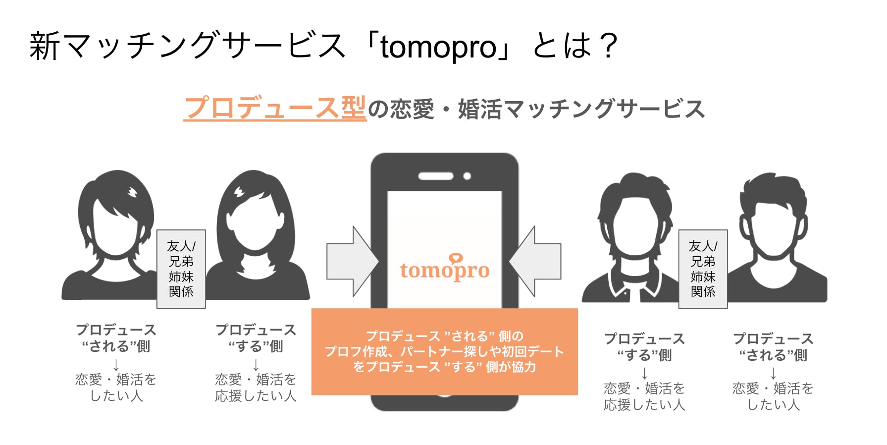 そんな疑問から、自分のことを深く理解してくれている、お友達や兄弟姉妹が恋活・婚活に協力してくれるサービスの必要性を感じ、本サービス「tomopro」のリリースを決意しました。