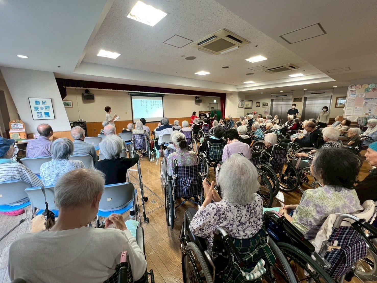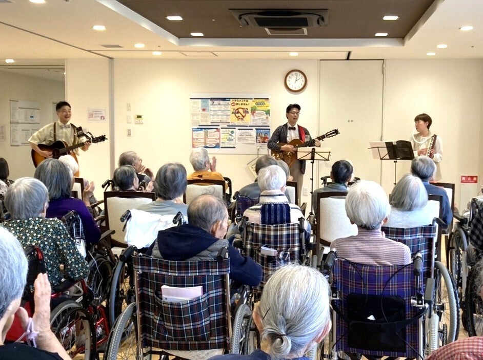 大変ご無沙汰しております。株式会社リビングプルーフの鈴木はるみです。前回、第8回目のレクリエーションコンサートを開催したのが、昨年10月。そこから半年ほど活動できず、申し訳ございません。 実は昨年11月に変形性膝関節症の手術を受け、3週間以上入院をしておりました。現在リハビリに通いながら、ようやく日常生活と仕事のペースに戻ったところです・・・。 とはいえ、レクリエーションコンサートの活動を止めていたわけではありません(^^)次の開催施設については、入院中にお話をいただいており、打ち合わせや見学など退院後も少しずつ準備を進めてまいりました。開催決定のご報告が直前になってしまったのですが、ちょうど2週間後の5月13日(水)に、第9回目のレクリエーションコンサートを開催できる運びとなりました! 今回伺うのは、文京区にある介護老人保健施設 音羽えびすの郷 さんです。 こちらは11階建ての建物の中にある介護老人保健施設で、5階から9階までがご入居者さまの居室フロアになっています。高~い!最上階には、通常リハビリなどを行っているイベントスペースもあるのですが、ご入居者さま全員が一度に集まることが難しいため、ミュージシャンのお二人と私が、5階から9階までの各フロアを回りながら、皆さまに生演奏をお届けする形で開催することになりました。(←まさに昭和の酒場をめぐって歌う『流し』スタイルです(^^)/)今回演奏をお願いするのは、ギター弾き語りとピアニカのユニット「キンピカ」のお二人。ギターと歌:カドアキツヨシさんピアニカ:金澤 美也子さん 昨年夏に、練馬区の高齢者施設で開催したレクリエーションコンサートでも演奏をお願いしたお二人で、その時も、イベントスペースでのコンサートのあと、会場まで来ることが難しかったご入居者さまのために、各フロアを回って1~2曲ずつ演奏してくださいました。演奏や歌唱の素晴らしさはもちろん、その場の空気を明るくあたたかくしてくださるお二人なので、今回のコンサートも、私自身とても楽しみにしています。当日の演奏予定曲は、こちら↓♪『高原列車は行く』『東京ラプソディ』『高校三年生』『ふるさと』(童謡)『好きになった人』『上を向いて歩こう』 どの曲も、これまでのレクリエーションコンサートで何度も披露してきた曲で、施設のおじいちゃん、おばあちゃんたちが、自然と口ずさんでくださったり、手拍子をしてくださったり、時にはノリノリで歌ってくださる曲ばかりです。音羽えびすの郷の皆さまがどんな表情で聴いてくださるのか、どんな歌声がフロアに響くのか、今からとても楽しみです♪♪♪ なお、音羽えびすの郷さんではプライバシー保護のため、フロアでの写真撮影は控えることになっています。ご入居者さまの後ろ姿や入居フロアなども含めて、撮影はNGとのことです。(フロアの壁いっぱいに入居者様のお写真が貼ってあるので・・・)そのため、当日のコンサートの様子を写真でお見せすることは難しいのですが、おじいちゃん、おばあちゃんたちのご様子や表情、その場の空気、歌声、笑顔をしっかり目に焼き付けて、後日、言葉でしっかりご報告させていただきますね(^^)/ この活動をずっと応援してくださり、本当にありがとうございます! 5月13日、音羽えびすの郷の皆さまの心が動く生の音楽を、心を込めてお届けしてまいります♪