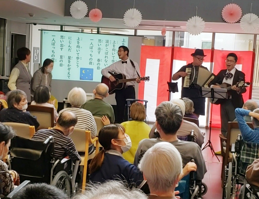 当日コンサート開催の前、業務の合間をぬって東京ノスタルジゴロのお二人とリハーサルしていただき、いざ本番! コンサートの後半、お名前を全員で呼びかけて登場された介護士さんは、いつものユニフォームではなく、蝶ネクタイの正装!!! ご利用者様も(私もw)ビックリしつつ、ますます盛り上がって…♪