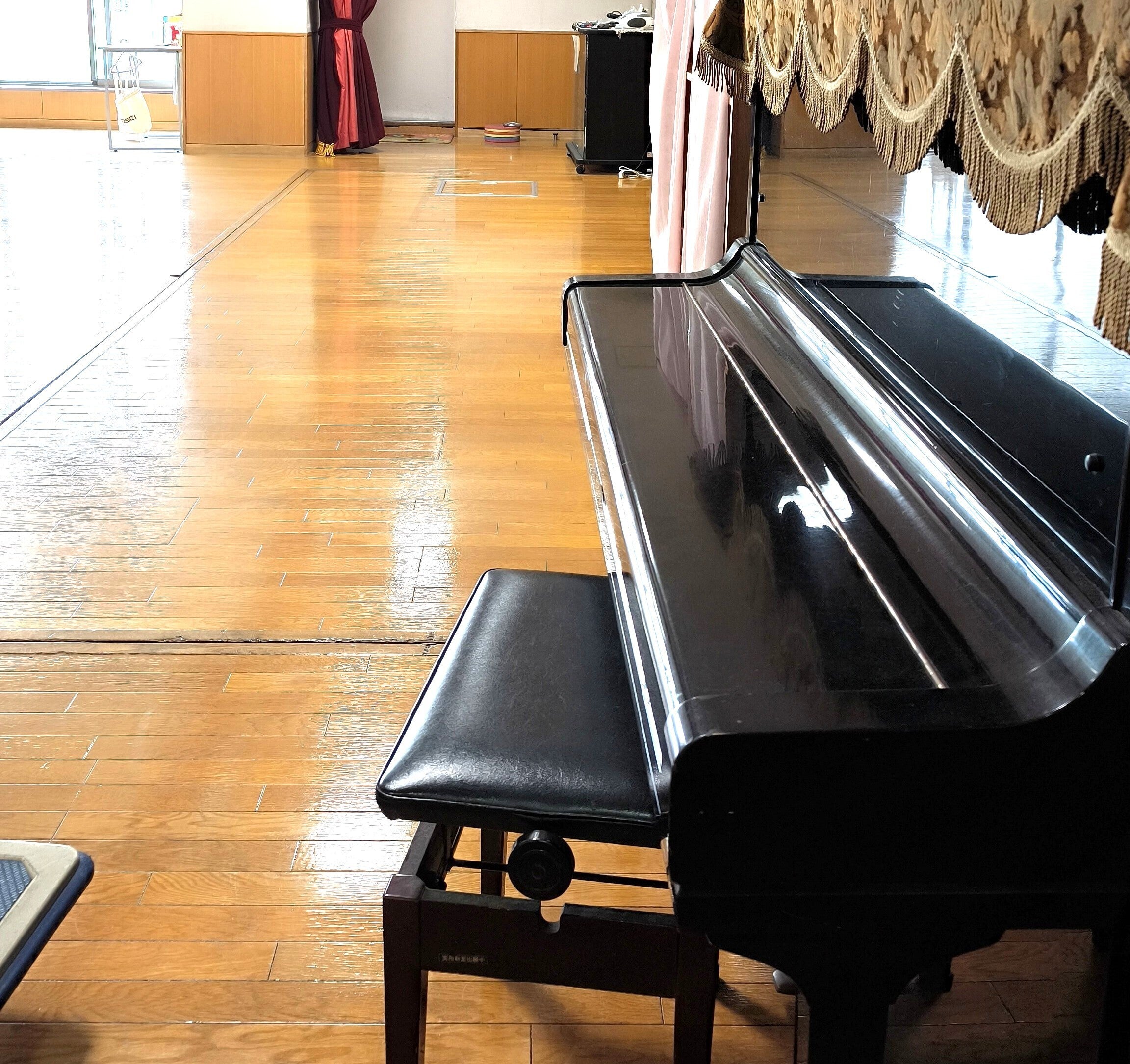 コンサート会場は1階受付前のオープンスペース。アップライトピアノがあるので、今回はこのピアノを活かした音楽をご入居の皆さまにお届けします♪