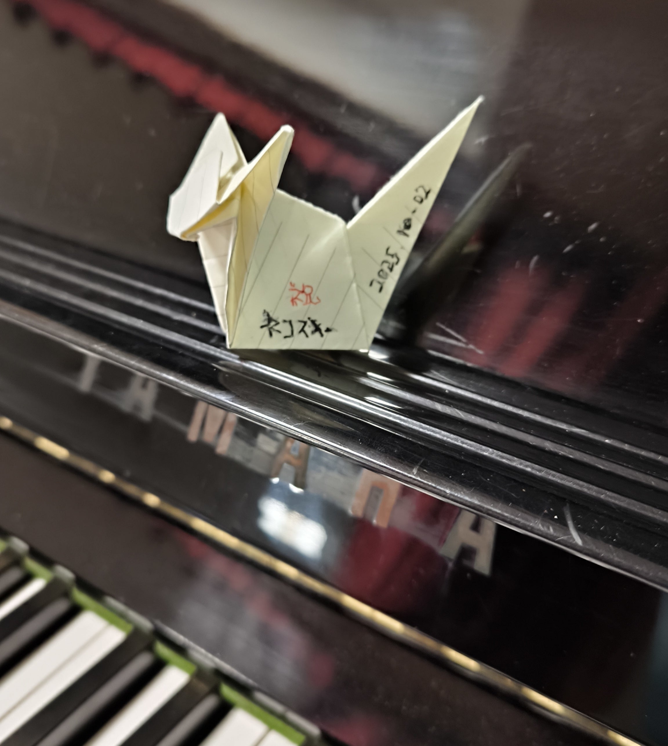 ピアノの上には、なんと可愛らしい猫の折り紙と一緒に『祝 ネコスキー』と書かれたメッセージが!(゚ロ゚)
